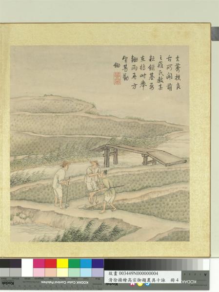 清徐揚繪高宗御題農具十詠 冊 稻田橋鋤 Hoes and a Bridge by the Paddy Field |