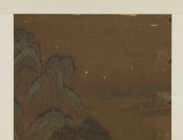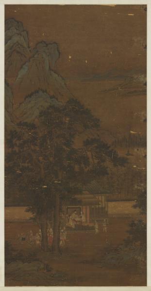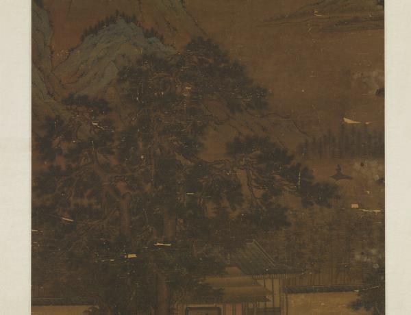 This painting depicts a small, green hillock on a mountainside. The dwelling and porch in the foreground were painted using the ruled line method. The tables, chairs, and wheels were all colored with reddish washes, providing a contrast to the green of the mountains and rocks. T'ang Ti used skill and care in painting this landscape, which embodies the spirit of archaic elegance.