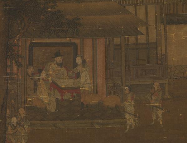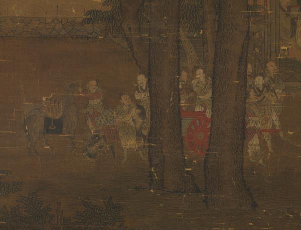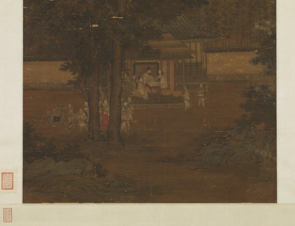 本幅山石以小青綠出之,近景屋宇臺階則以界畫表達,技巧純熟而工整。桌椅車輪以紅色朱砂漬染,與山石的青綠相互映發,頗具古雅之趣。