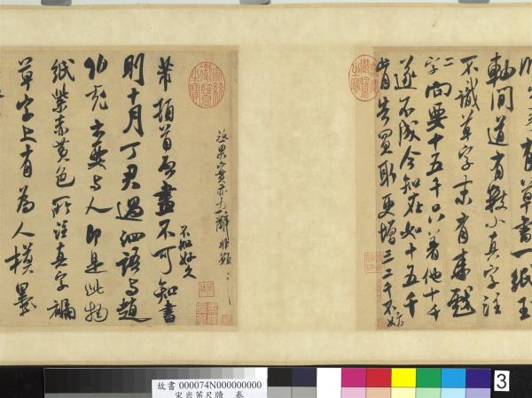 (第一幅)蒙面諭浙幹。具如後。(恐公忙。託鼎承)。長洲縣西寺前僧正寶月大師。收翟院深山水兩幀。第二幀上。一秀才跨馬。元要五千賣。只著三千。後來寶月五千買了。如肯輟。元直上增數千買取。蘇州州衙前。(是晉公繪像恩澤)。西南上。丁承務家秀才。(丞相孫)。新自京師出來。有草書一紙。黃紙玉軸。間道有數小真字注。不識。草字末有來戲。(二字)。向要十五千。只著他十千。遂不成。今知在。如十五千肯。告買取。更增三二千不妨。(第二幅)(丞果實亦力辭。非願非願)。芾頓首啟。畫不可知。(不知好久)。書則十月丁君過泗。語與趙伯充。云要與人。即是此物。紙紫赤黃色。所注真字褊。草字上有為人模墨透印損痕。末有二字來戲。(辯才)。字也。告留念其直。就本局虞候撥供給外。或能白吾老友吳舍人。差兩介送至此。尤幸尤幸。再此。芾頓首上。伯修老兄司長。(不記得也。在紙尾)。來戲。(辯才字)。(第三幅)此晉紙式也。可為之。越竹千杵裁出。陶竹乃復不可杵。只如此者乃佳耳。老來失第三兒。遂獨出入不得。孤懷寥落。頓衰颯。氣血非昔。大兒三十歲。治家能幹。且慰目前。書畫自怡外。無所慕。芾頓首。二曾常見之,甚安。(第四幅)百五十千與宗正爭取蘇氏王略帖。(右軍)。獲之。梁唐御府跋記完備。黃祕閣知之。可問也。人生貴適意。吾友覷一玉格。十五年不入手。一旦光照宇宙。巍峨至前。去一百碎故紙。知他真偽。且各足所好而已。幸圖之。米君若一旦先朝露。吾兒吝。萬金不肯出。芾頓首。(第五幅)芾再啟。賀鑄能道行樂。慰人意。玉筆格十襲收祕。何如。兩足其好。人生幾何。各閼其欲。即有意。一介的可委者。同去人付子敬二帖。來授玉格。卻付一軸去。足示俗目。賀見此中本。乃云。公所收紙黑。顯偽者。此理如何。一決無惑。芾再拜。(第六幅)丹陽米甚貴。請一航載米百斛。來換玉筆架。如何。早一報恐他人先。芾頓首。(第七幅)敬聞命。此石亦不惡。業鏡在台州耳。芾頓首。伯充台坐。彥臣如何。(第八幅)芾皇恐。蒙惠柑。珍感珍感。長茂者適用水煮起。甜甚。幸便試之。餘卜面謝。不具。芾頓首。司諫台坐。(第九幅)戲成呈司諫台坐。芾。我思岳麓抱黃閣。飛泉元在半天落。石鯨吐水。(水字點去)。出湔一里。赤日霧起陰紛薄。我曾坐石浸足眠。時項抵水洗背肩。客時效我病欲死。一夜轉筋著艾燃。(關漼)。如今病渴擁爐坐。安得縮卻三十年。嗚呼。安得縮卻三十年。重往坐石浸足眠。 |