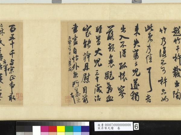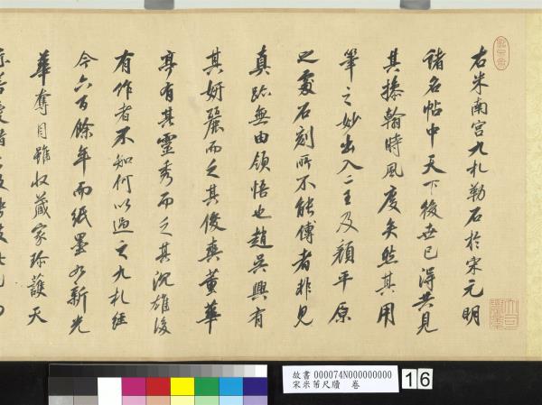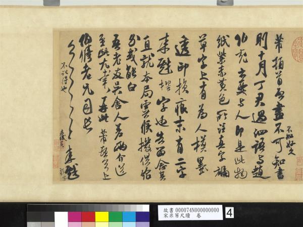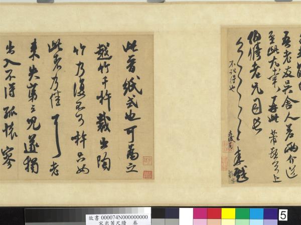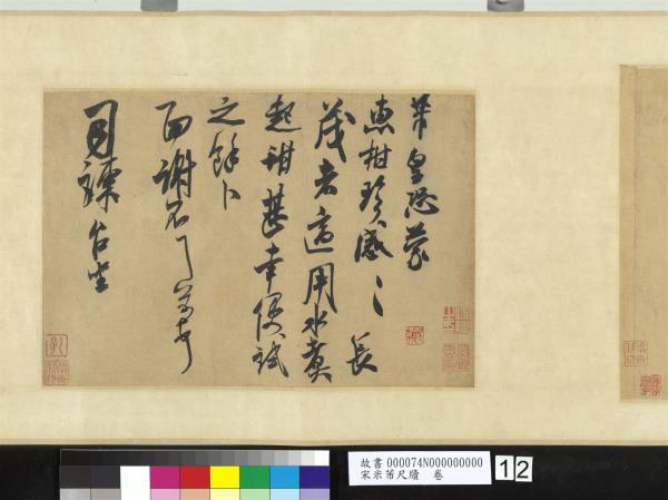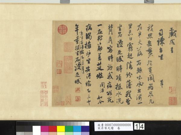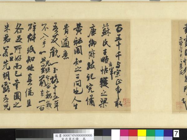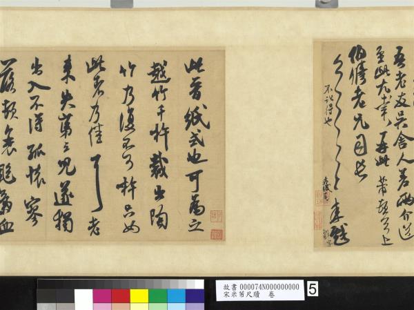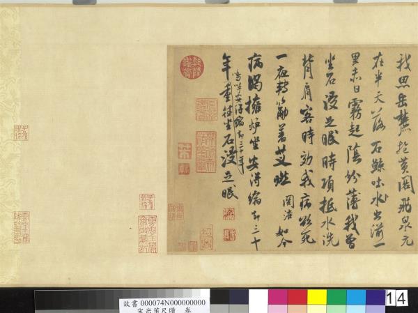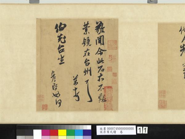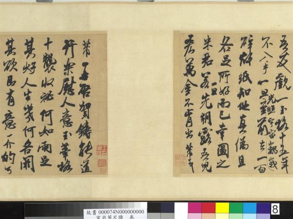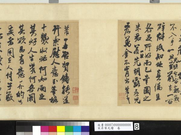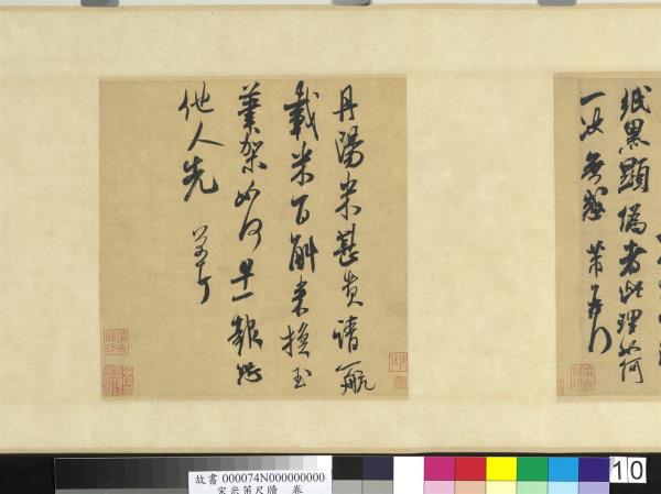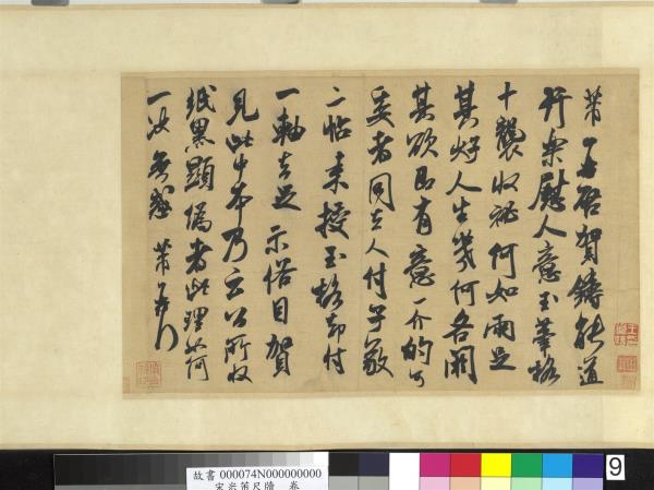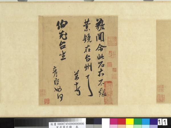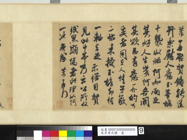 本卷九幅,書寫時間約在崇寧元年、二年間(1102,1103),談及購求王羲之<來戲帖>、<王略帖>,翟院深山水畫及竹紙、玉筆格、奇石等,末一幅書七言詩一首,追憶三十年前長沙之事,可窺其晚年浸淫於書畫古玩的生活情趣,用筆也縱橫如意,信手寫來,毫無滯礙,十分精彩。