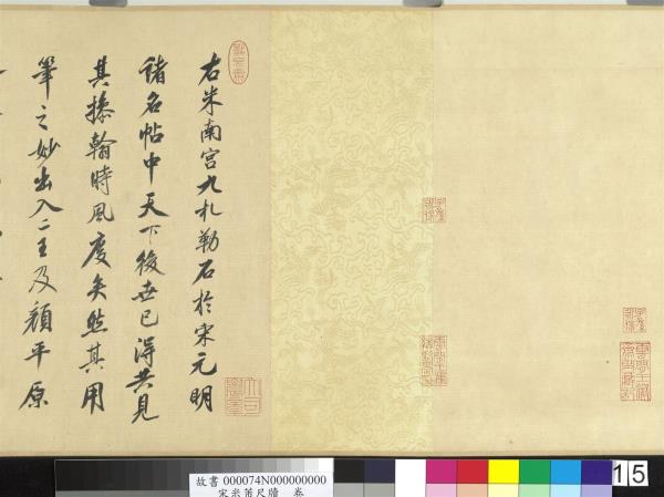 右米南宮九札。勒石於宋元明諸名帖中。天下後世。已得共見其操翰時風度矣。然其用筆之妙。出入二王及顏平原之處。石刻所不能傳者。非見真跡。無由領悟也。趙吳興有其妍麗而乏其俊爽。董華亭有其靈秀而乏其沉雄。後有作者。不知何以過之。九札經今六百餘年。而紙墨如新。光華奪目。雖收藏家珍護。天亦若愛惜之。故能致此。尤為可寶也。康熙五十七年(西元一七一八年)歲次戊戌冬十一月朔。橫雲山人王鴻緒題。