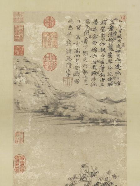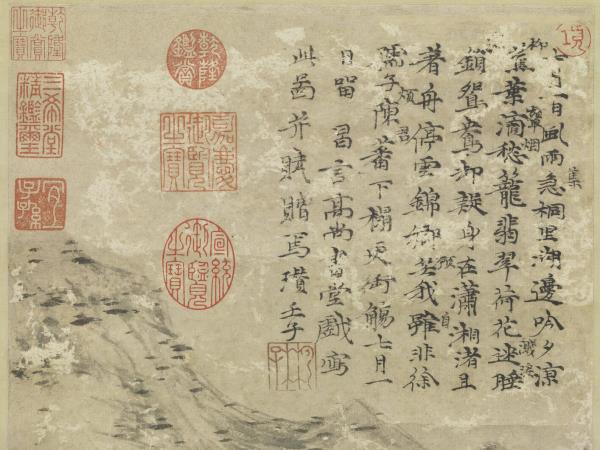 七月一日風雨急(旁作集)。桐里湖邊吟夕涼。蕉(旁作柳)葉滴愁(旁作顰煙)籠翡翠。荷花迷睡(旁作濺淚)鎖(旁有一字漫漶)鴛鴦。卻疑身在瀟湘渚。且著舟停雲錦鄉。笑(旁作顧)我雖(旁作自)非徐孺子。陳蕃(旁作煩君)下榻更御觴。七月一日留昌言高尚書堂。戲寫此圖。并賦贈焉。瓚。壬子(西元一三七二年)。 |