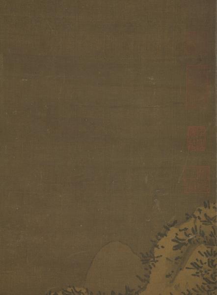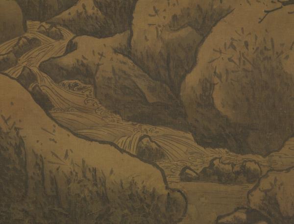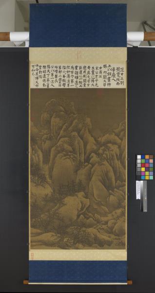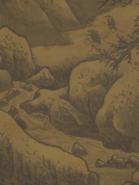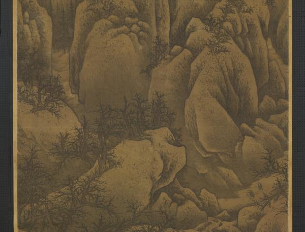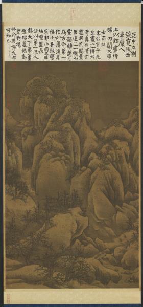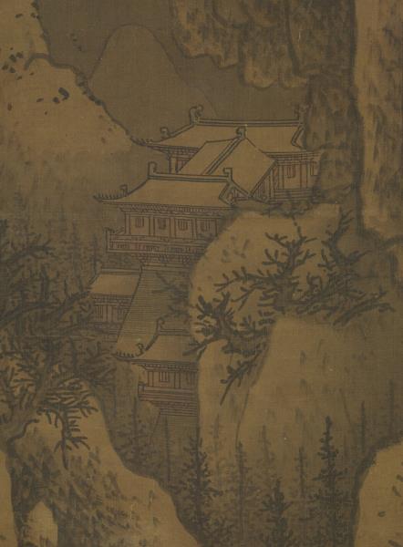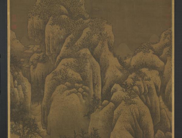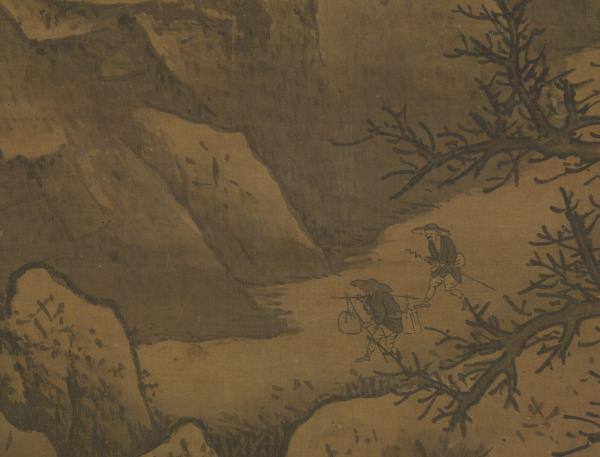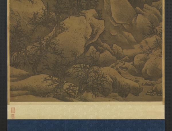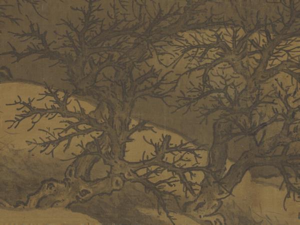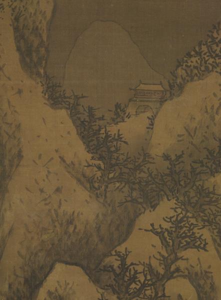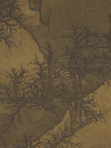 Snow covers the forests and mountains in this painting with many craggy trees for a bone-chilling effect. A winding path leads into a steep valley to the left, where a cluster of temple buildings are seen. The thick, twisting trunks of the leafless trees appear as solid and stiff as iron, and the branches project in all directions like swords and lances for a solemn, archaic brushwork. Although the later inscription by Wang T’o claims that this came from the hand of Fan K’uan, it bears no seal or signature of the artist. The brushwork also differs from that of Fan, probably representing a later interpolation.