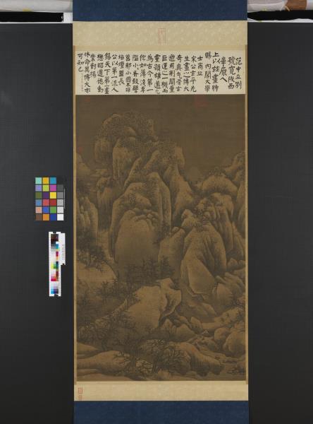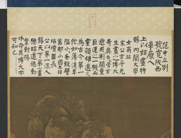 范中立。別號寬。陝西華原人。上以茲畫特賜內閣大學士商丘宋公玄平先生。畫之博大奇奧。氣骨玄邈。用荊關董巨。運之一機。而靈運雄邁。允為古今第一。佗如薄淺單隘。小小有致。譬莒邾小國。本非坫壇盟長。公以第一流人。錫天下第一畫。懋昭道德勳業。對揚休命。其博大亦可知已。順治六年上巳。王鐸觀識。
