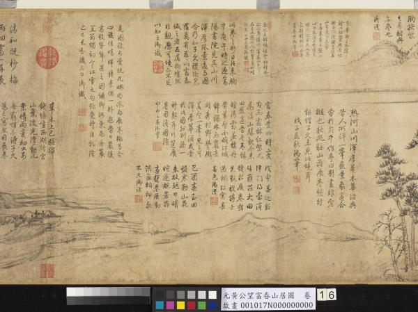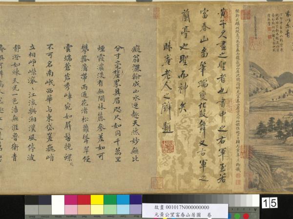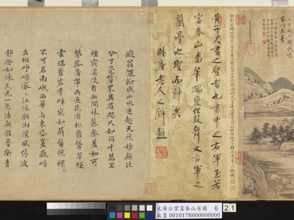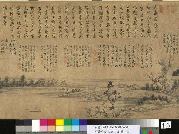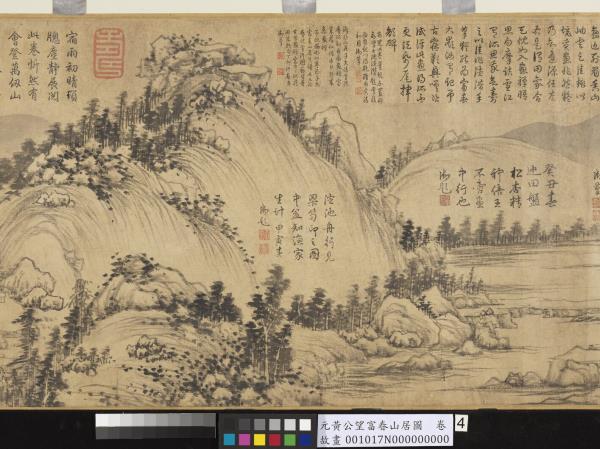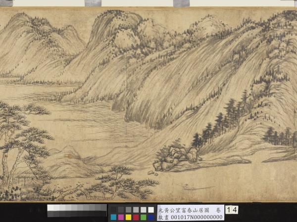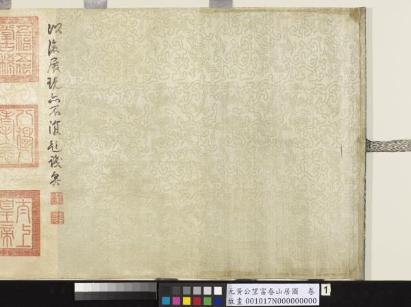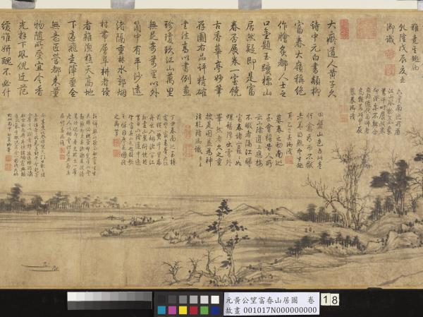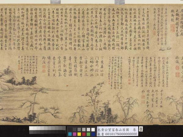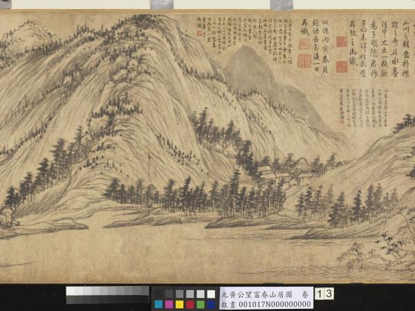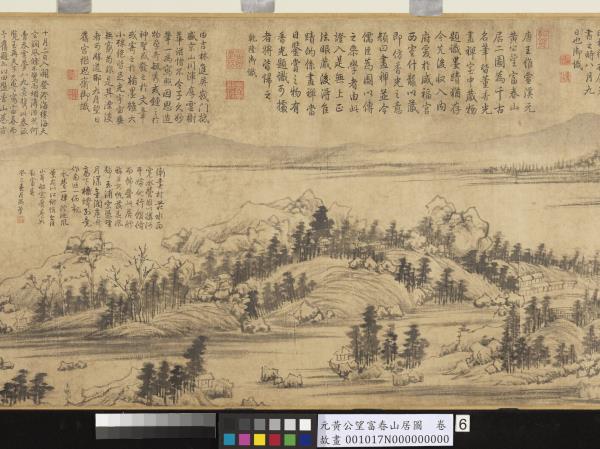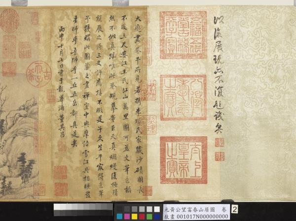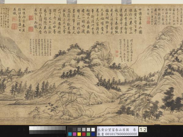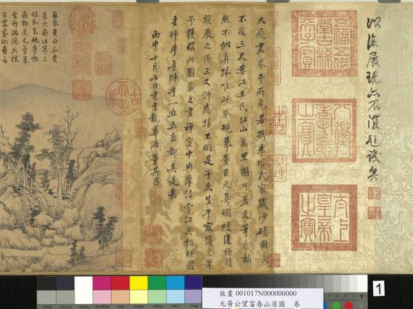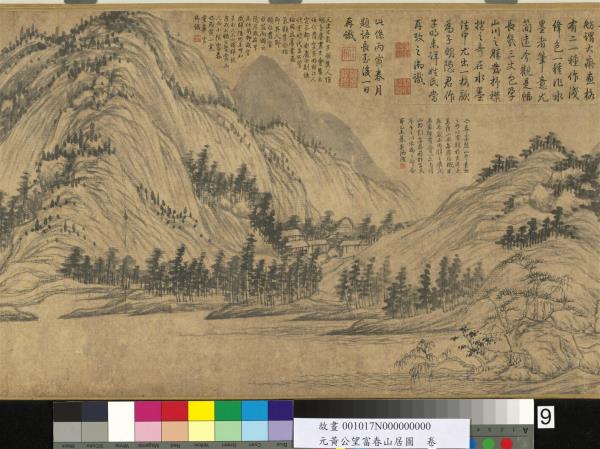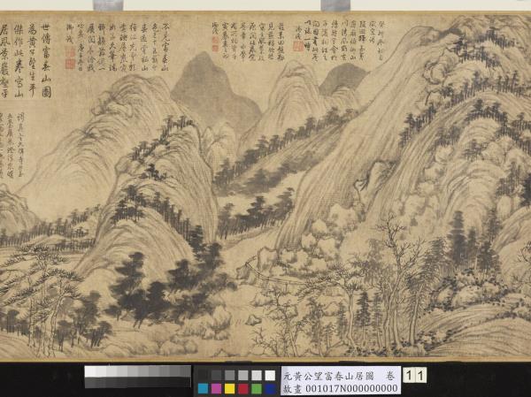 網頁展示說明 此卷構圖景物與無用師卷大致相同,起首保留了前段剩山圖,但卷末缺主山一段。題識云1338年秋天,為將歸杭州的子明隱君繪此圖贈別,因此一般簡稱此作為〈子明卷〉。 清高宗於1745年收入此卷,第二年又購得〈無用師卷〉,認為〈子明卷〉為真蹟,〈無用師卷〉為仿本,引發後世熱烈的辯論。經現代學者研究,比較兩本筆墨造詣,確認此卷實係仿本。不過此卷保留〈剩山圖〉一段,為理解〈富春山居圖〉原貌的重要參照本。(20110609)