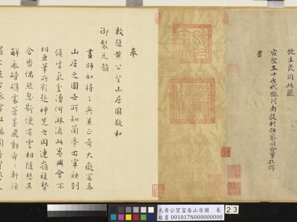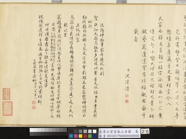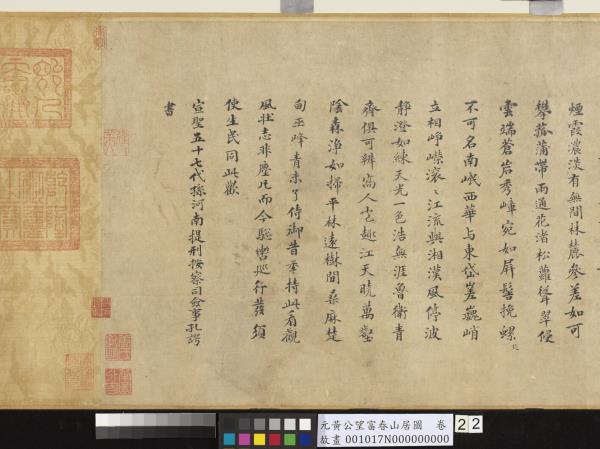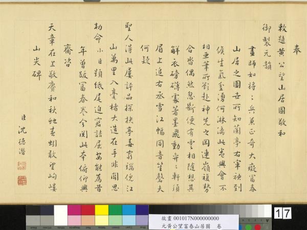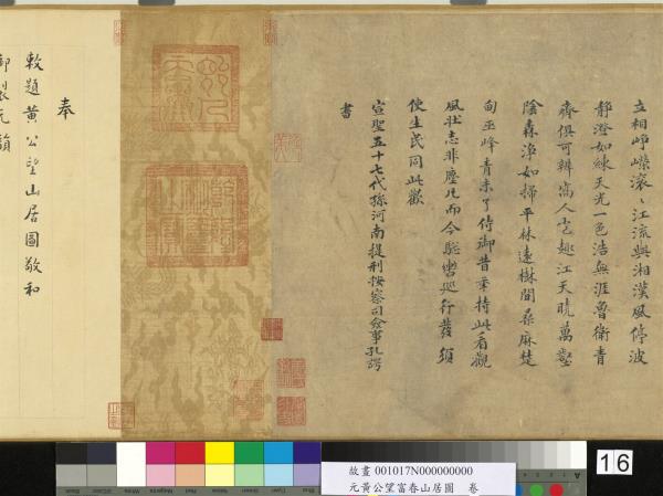 題跋 清高宗 本幅 乾隆丁卯(西元一七四七年)春正御筆 行書 富春疑案叅來久。今喜辨眀楊即栁。高王目迷何足云。壓倒徳潜談天口。我非博古侈精鑒。是是還應别否否。沈文王氏乃捉刀。華亭晉陵仍左右。始識流傳祇一圖。珷玞安可同瑶玖。笑予赤水索元珠。不識元珠吾固有。如浮海者必由河。如登山者必歷阜。縱云露柱即燈籠。坐令優孟望而走。每讀班賦發深思。貴耳末學多膚受。吳下詩人即趨闕。試與觀之應覺醜。還續長言當自訟。庶使此圖更因壽。余既辨明此圖即富春山居圖。乃疊舊韻更為長歌。以書其後。乾隆丁卯(西元一七四七年)春正御筆。