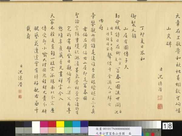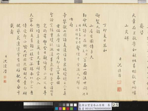 題跋 沈德潛 印記 expand_more 拖尾 臣沈德潛。 行楷書 丁卯(西元一七四七年)夏日恭和臣。御製元韻。山居有圖傳子久。敕命賦詩日在栁。(小字。丙寅夏)富春一圖流世間。(小字。自沈周至髙士奇。王鴻緒諸家)聲價千金滿人口。歸之内府帝鑒觀。兩圖誰是復誰否。衆眼矇瞇云亦云。真者偏左贋偏右。山居即是富春圖。聖論定餘重瓊玖。淋漓墨氣骨相蒼。空諸所有包所有。譬登日觀俯羣山。梁父云亭惣堆阜。舊藏香光畫禪室。今入天家不脛走。畫雖一技宗派殊。南北分宗遞傳受。即小喻大理固然。程材尤貴分妍醜。藝苑遭逢會有時。好配右丞千載壽。臣沈徳潛。