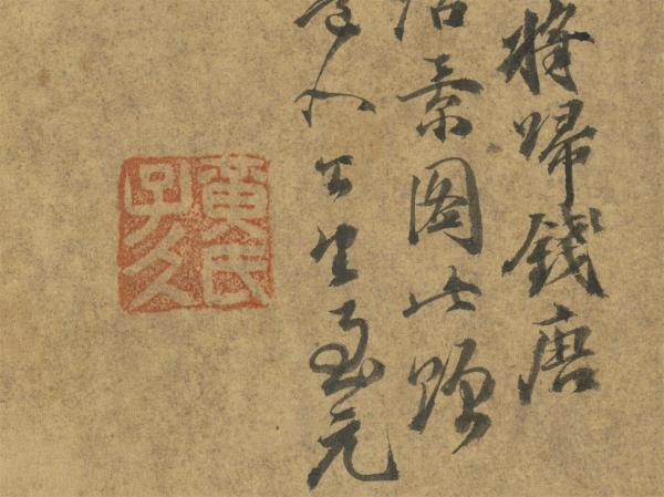 作者款識 黃公望 印記 expand_more 本幅 子明隱君將歸錢唐。需畫山居景。圖此贈別。大癡道人公望。至元戊寅(西元一三三八年)秋。 草書