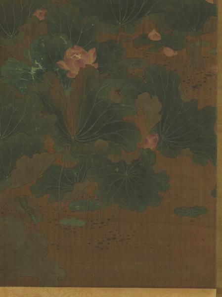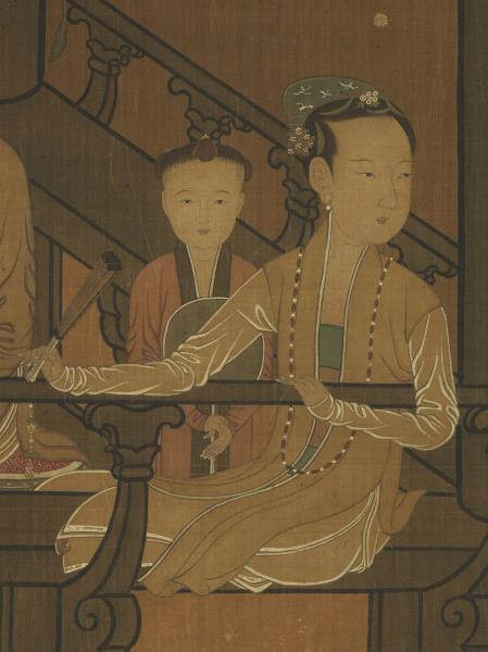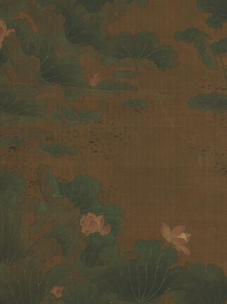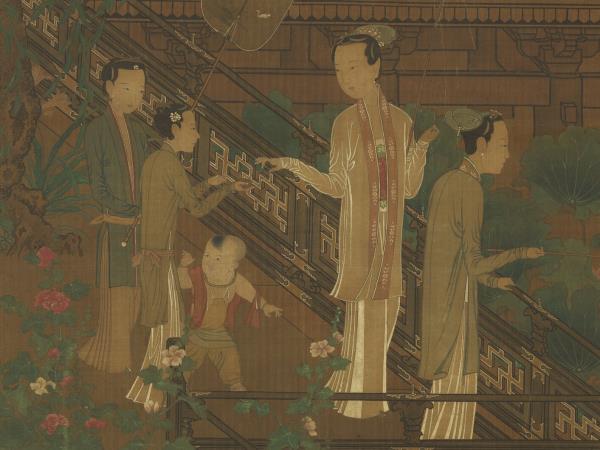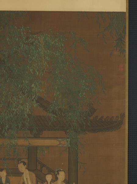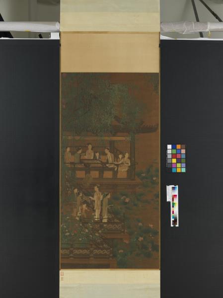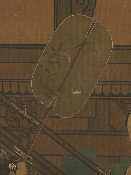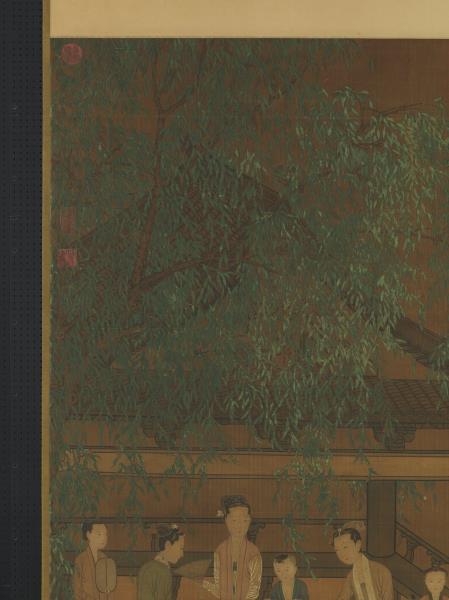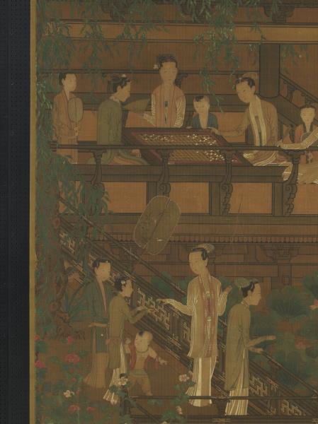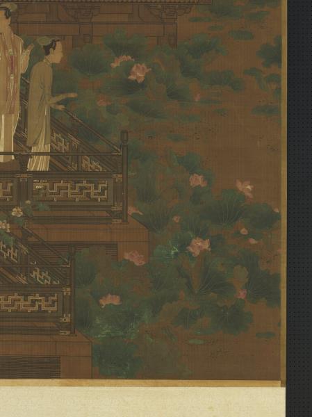 A pavilion built over a pond has been rendered with ruled-lines and is bordered by a weeping willow. Two ladies face each other on either side of a game board as another watches. A lady rests by the railing. The lotus pond is in full bloom, making for a field of verdant leaves. Outside, ladies are fishing to make for an idyllic summer scene of relaxation and joy. The brushstrokes throughout the painting are delicate and fine, while the coloring is pure and beautiful. Though traditionally attributed to Chou Wen-chu, the style and forms all reveal the those of the Ming (1368-1644) and Ch'ing (1644-1911) dynasties.