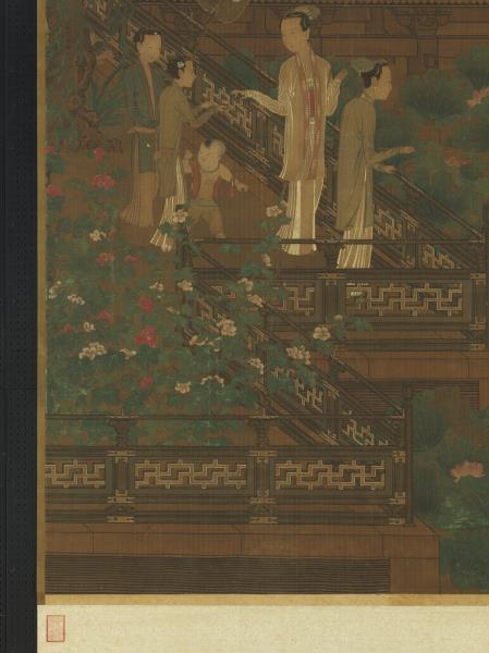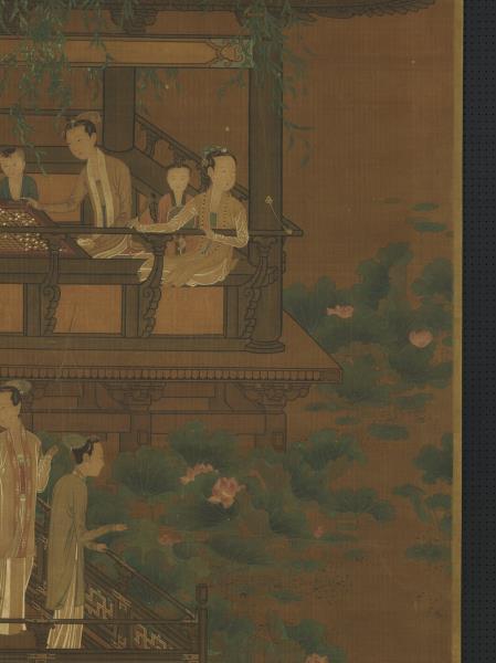 界畫亭榭臨池,前後碧柳四垂,二女亭中對奕。亭外池荷盛開,翠葉田田。仕女或倚欄垂釣或持扇觀荷,一派夏日悠閒景象。通幅屋界、衣飾刻畫精細,粉花綠葉著色清麗,本幅舊傳為南唐周文矩之作,唯筆墨、器用皆顯露出明清習氣。