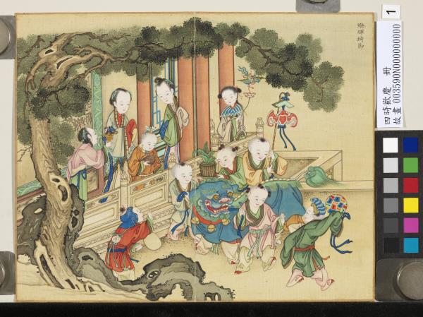 This unsigned painting is the first leaf of an album entitled Celebrations of the Four Seasons. Six children gracefully perform the lion dance in a garden at the New Year. Three court ladies leading children appreciate the spectacle from a terrace. One child holds a pomegranate, a symbol of fertility. Another holds a lantern decorated with the bat motif, which symbolizes happiness and blessings. The colors are applied with rich clarity, and the brushwork is fine.