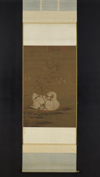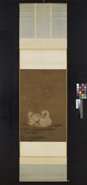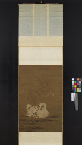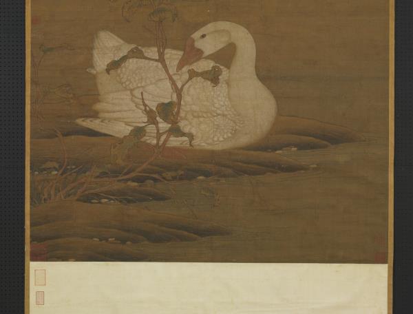 Description Emperor Hui-tsung's personal name was Chao Chi. He was a graet patron of the arts, an excellent essayist, and a calligrapher of rank. He also excelled at painting landscapes, birds, flowers, and figures. The style of his calligraphy is called "slender gold" and has an uninhibited, tensile strength. A flowering polygonum plant springs up from a sloping bank. Beneath its branches a white goose stands, nuzzling and preening as if ready for a nap. The plant has been rendered with curling leaves in varying positions, and its branches have been arranged into graceful sprays. Lead white has been used to outline the plumage of the smooth egg-shaped stones at the edge of the water. The glowing colors have been chosen to create the effect of an autumn wilderness. Such a scene makes the viewer feel somewhat dazed, as if he were actually standing on the banks of a stream in ancient days. This painting along with A pair of wild Geese By an Autumn Pond attributed to a Sung dynasty artist also in the museum's collection, however, is a copy by a later artist.