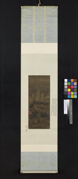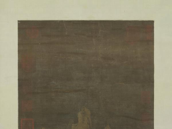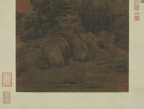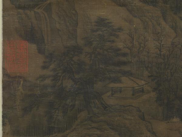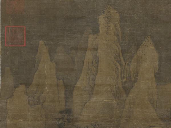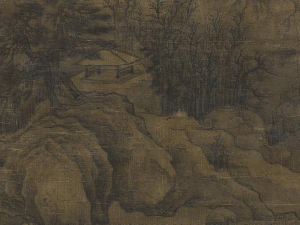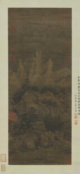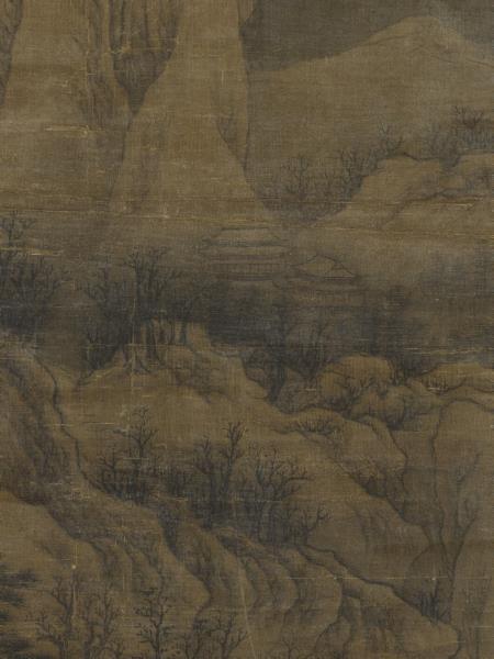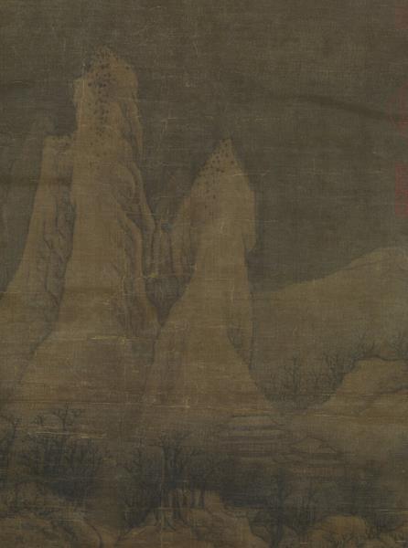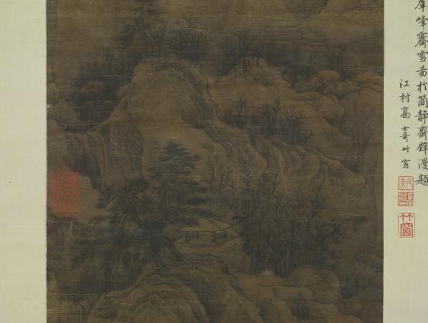Li Ch’eng descended from a T’ang imperial family seeking refuge in Ying-ch’iu. This work depicts snowy peaks and wintry trees interspersed with a stream, empty pavilion, and temple architecture. Though with neither seal nor signature of the artist, a 1698 inscription on the mounting from the collector Kao Shih-ch’i mentions “Chien-ching Studio among Clustered Peaks After Snowfall in Ying-ch’iu.” Li Ch’eng excelled at landscapes of wintry forests, with many later such works attributed to him. The ink here is relatively thick, the earthen forms revealing dark, small “axe-cut” texture strokes and ink washes to impart atmosphere. Also, the small strokes, flat peaks and layered ridges suggest a late Ming dynasty (1368-1644) imitation.