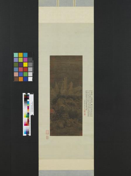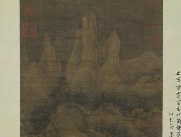 李成(西元九一六—九六七年),其先唐宗室,避地營丘,因而徙家居此。本圖畫雪峰寒樹,泉流、空亭、寺院點綴其間。畫無名款,經清初高士奇收藏,裱綾一六九八年題中有「懸營丘羣峰霽雪圖於簡靜齋」語,應為畫名由來。李成擅畫山水寒林,後世相關母題多託其名。本幅用墨較濃,山石以類似小斧劈皴擦暗面;全幅烘染,表現氤氳之氣。然用筆細碎,山勢疊嶂較為平面,或為晚明仿作。