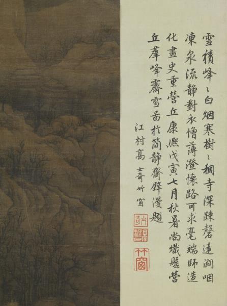 雪積峰峰白。烟寒樹樹稠。寺深疎磐遠。澗咽凍泉流。靜對衣憎薄。澄懷路可求。毫端師造化。畫史重營丘。康熙戊寅(1698)七月。秋暑尚熾。懸營丘群峰霽雪圖於簡靜齋壁。漫題。江村高士奇竹窗。 |