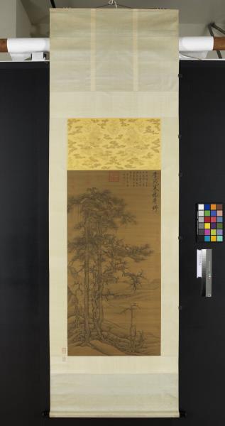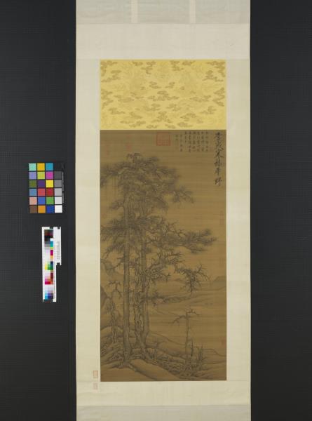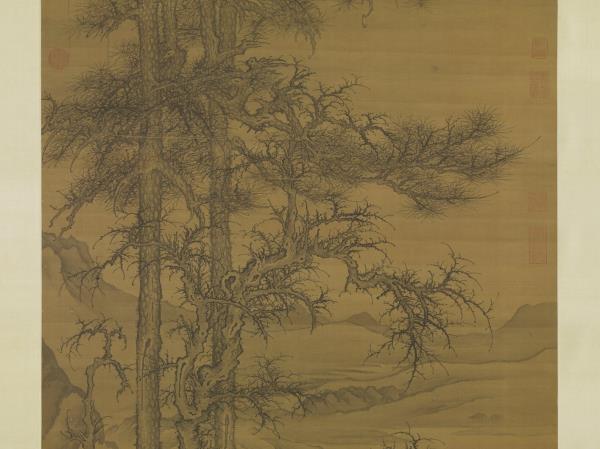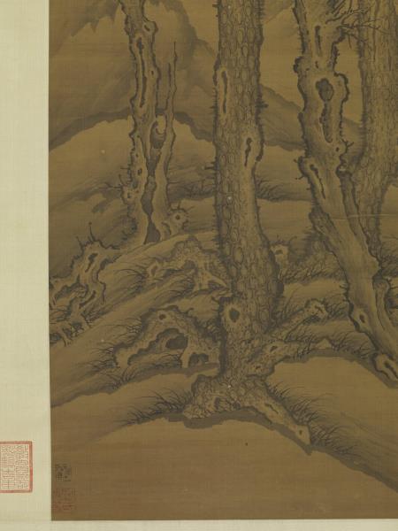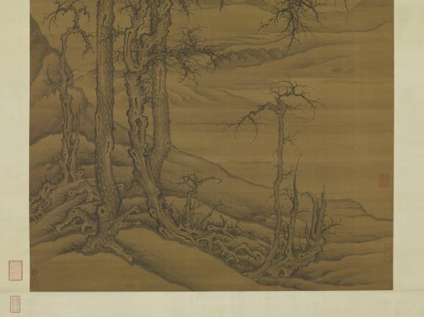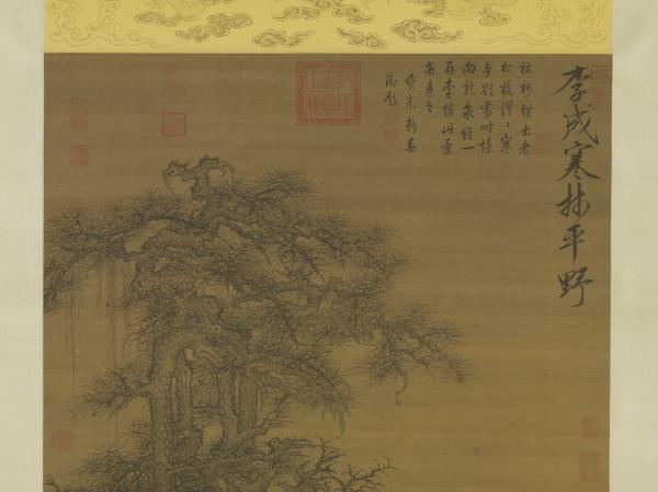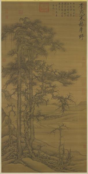 水岸畫老松枯木,背景則山水平遠,景物蕭疏空闊。無作者款印,右上角仿題「李成寒林平野」。李成(西元九一六-九六七年),字咸熙,唐皇室後裔,本住陝西長安,唐末遷山東青州。個性放蕩不羈,好飲酒吟詩,善畫山水。李成作品於北宋末已極稀少,根據記載其畫筆墨精微,善於表現「氣象蕭疏,煙林清曠」的意境。本幅樹石畫法模仿李成寒林特徵,從畫風看應為明代仿作。(20120103)