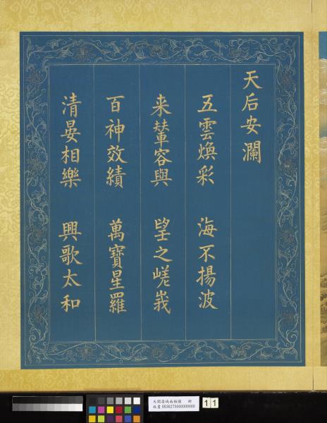 天后安瀾。五雲煥彩。海不揚波。來輦容與。望之嵯峨。百神效績。萬寶星羅。清晏相樂。興歌太和。 |