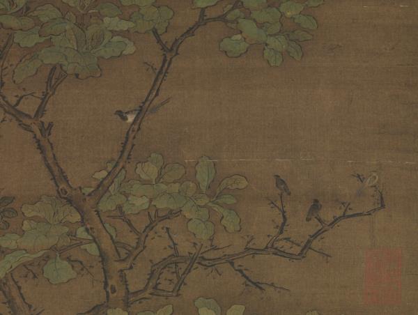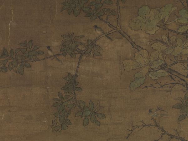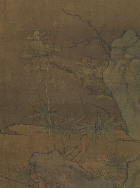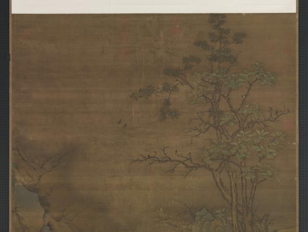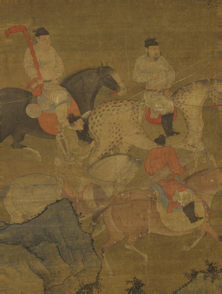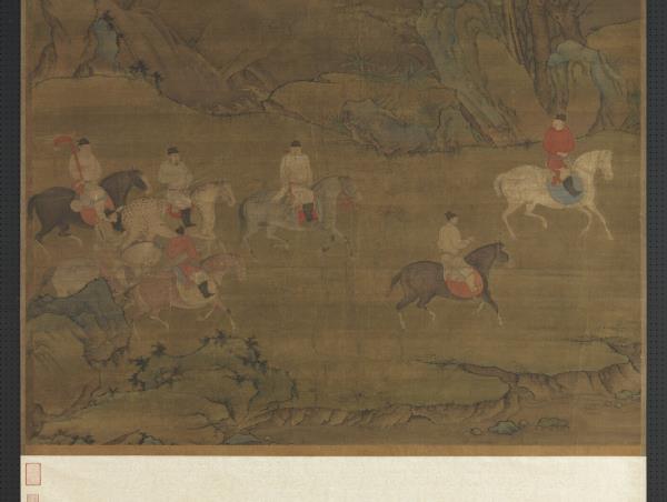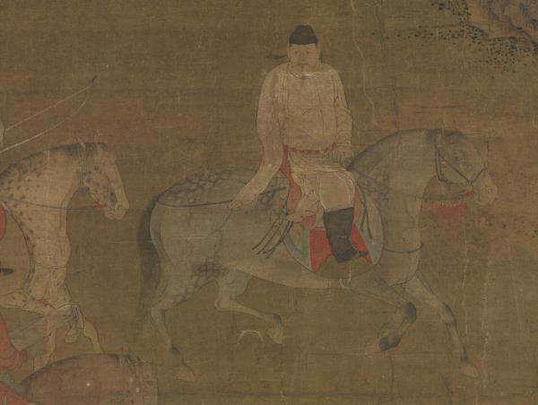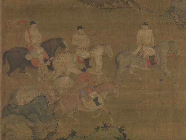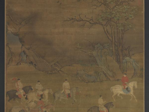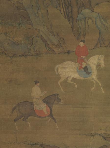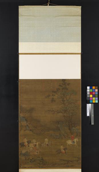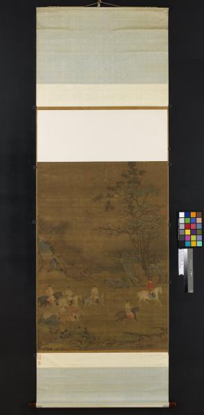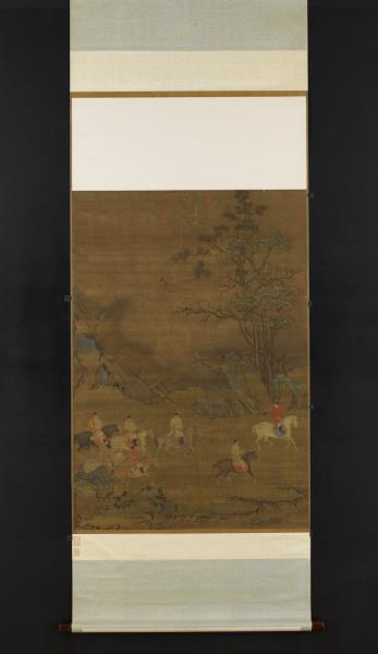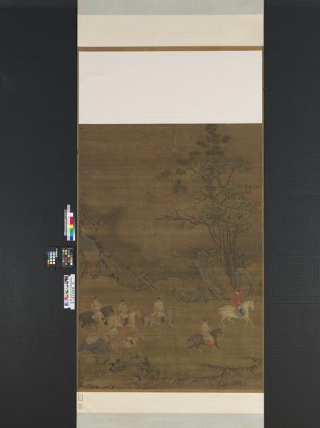 In this painting, seven riders are seen on an outing. The figure in the center is rendered frontally and wears clothing different from the other six, indicating that he may be the host. Two figures are in the lead and the others are behind carrying such items as a sword, polo club, lute, and wine. The tree leaves were done in outlines filled with colors, while the earthen forms and water were all done in imitation of an ancient method of outlining and washes of color to give the painting a decorative effect. The trees and forms in the background are similar to those in a painting attributed to Han Kan (fl. 8th c.) entitled "Gibbons and Horses" in the Museum collection, but slightly weaker in terms of brush and ink. It thus may have been done after the same original.