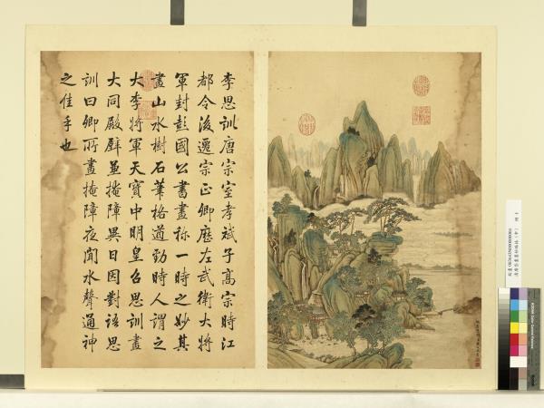 李思訓。唐宗室孝斌子。高宗時江都令。後遷宗正卿。歷左武衛大將軍。封彭國公。書畫稱一時之妙。其畫山水樹石。筆格遒勁。時人謂之大李將軍。天寶中明皇召思訓。畫大同殿壁兼掩障。異日因對語思訓曰。卿所畫掩障。夜聞水聲。通神之佳手也。 |