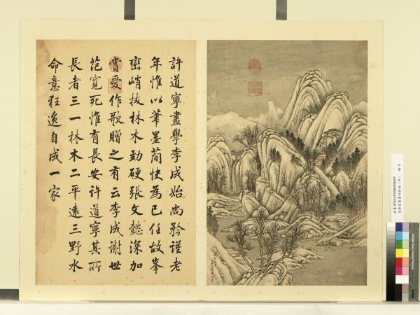 許道寧。畫學李成。始尚矜謹。老年惟以筆墨簡快為己任。故峰巒峭拔。林木勁硬。張文懿深加賞愛。作歌贈之。有云。李成謝世范寬死。惟有長安許道寧。其所長者三。一林木。二平遠。三野水。命意狂逸。自成一家。 |