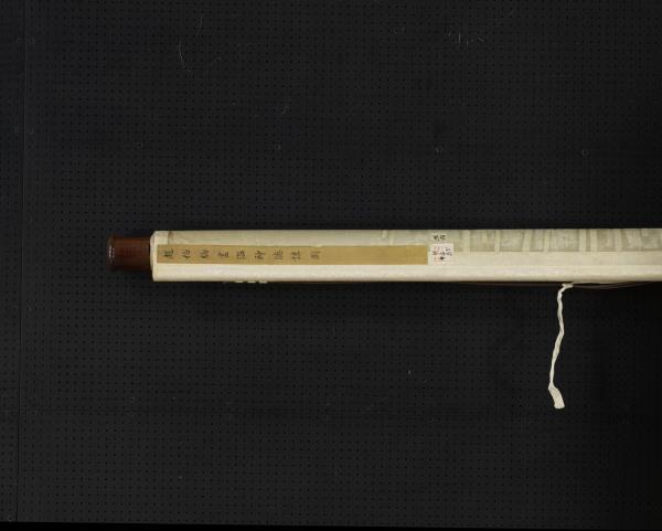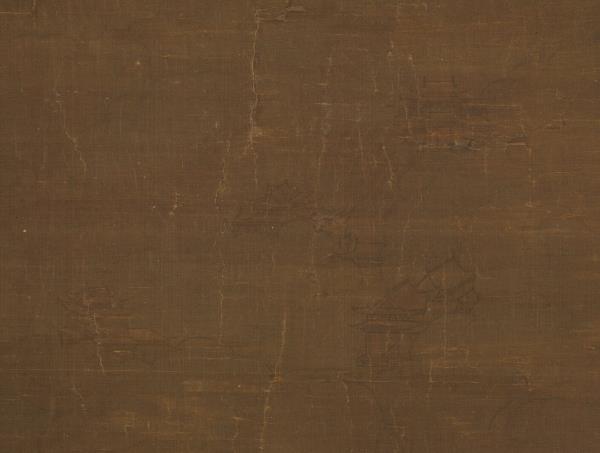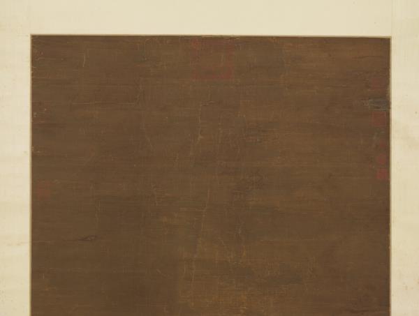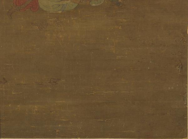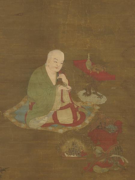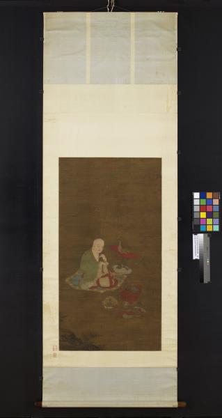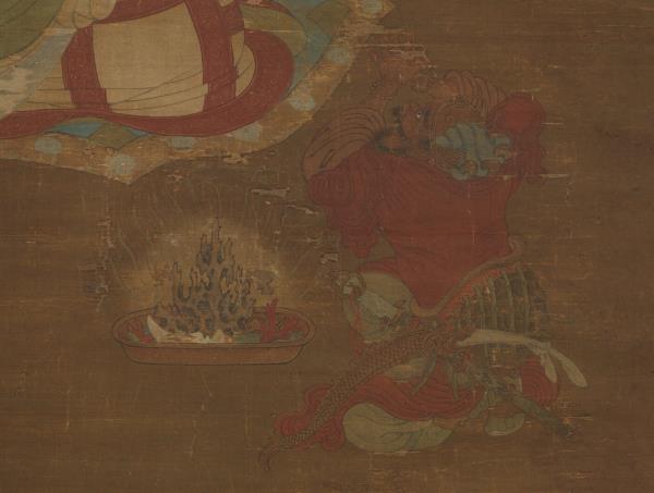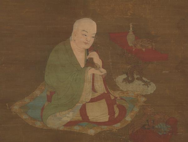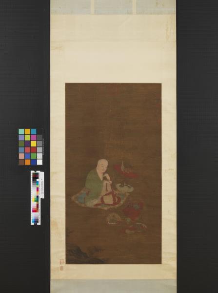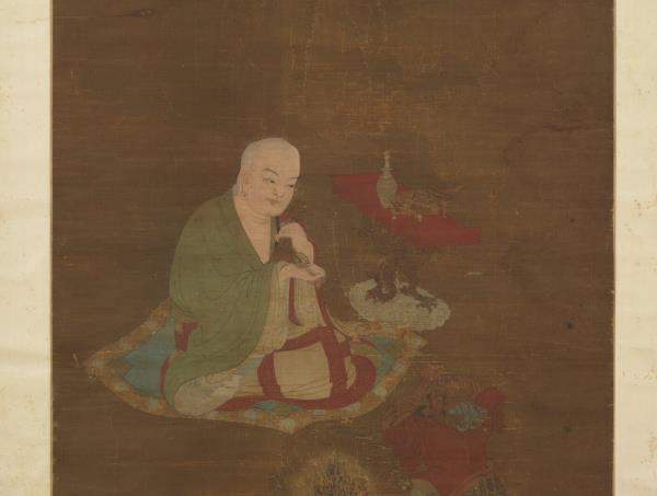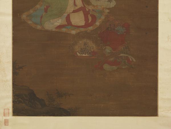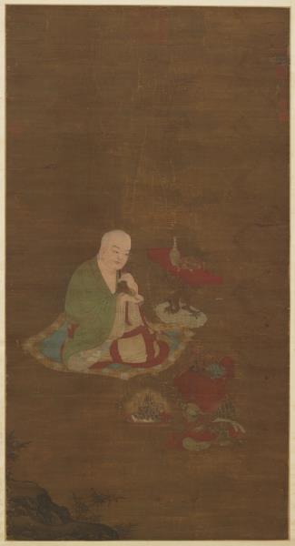 Chao Po-chu was a member of the Sung Imperial house, being descended in the seventh generation from T'ai-tsu emperor. He excelled at painting landscapes, figures, and architecture, but was also competent in bird and flower paintings. He painted his figures with moist brush and was able not only to portray his subjects with fresh charm but also with accurate grasp of their characteristics. This painting shows a lohan sitting cross-legged on a rug, expounding scripture. Below is kneeling an ocean spirit wearing both sword and bow who has come to attend the ritual. In the foreground is a magic vessel offered by the ocean spirit. From a vase on the table emanates incense smoke, which rises into mid-air and reveals heavenly palaces and halls. The age of the silk makes the picture dark and somewhat unclear. However, the figures are painted with such vigour of stroke and the colors possess such calm and purity that the essential spirit of the work remains unimpaired.