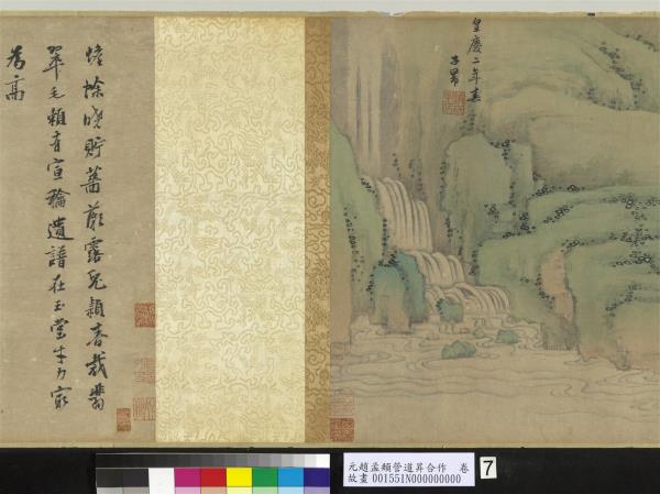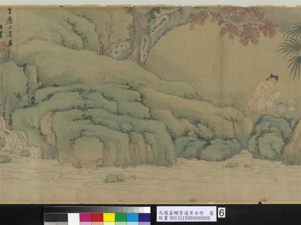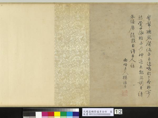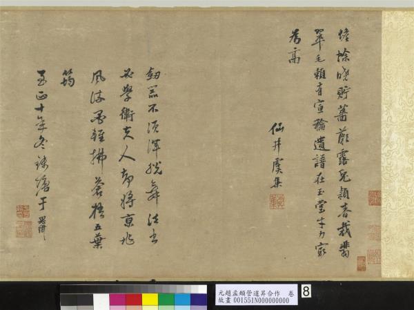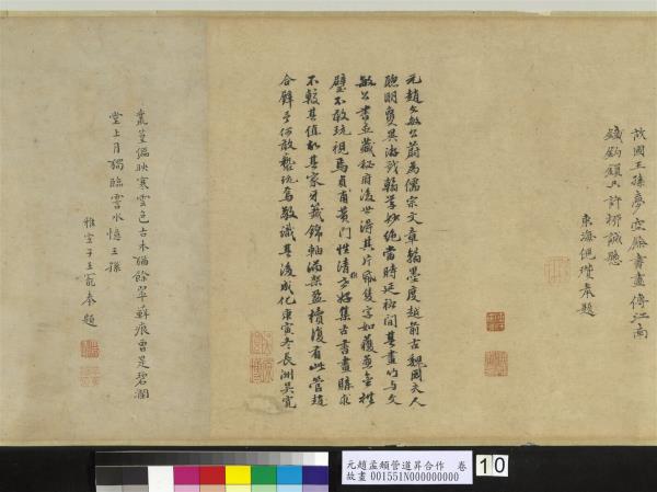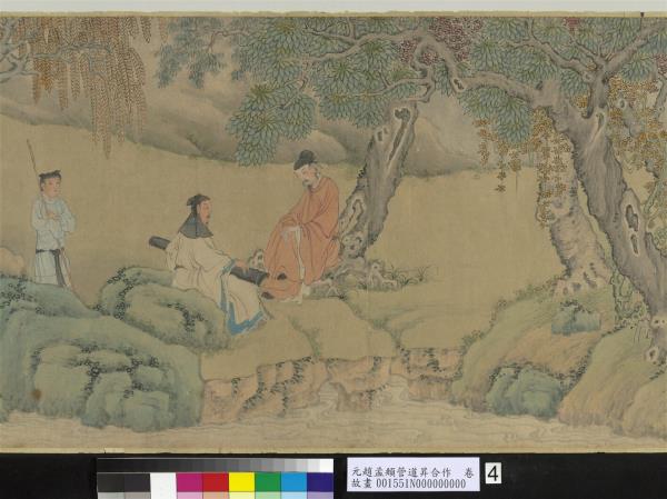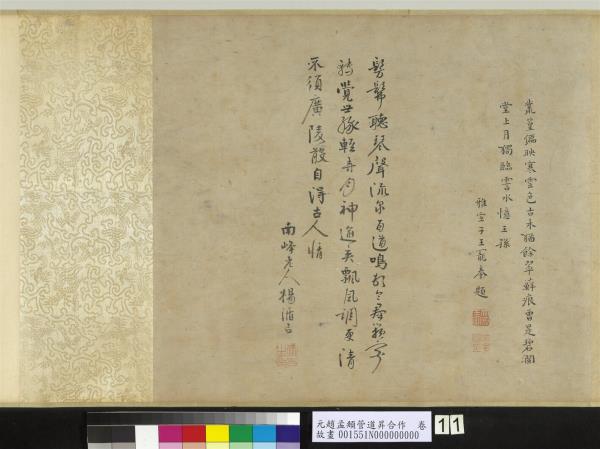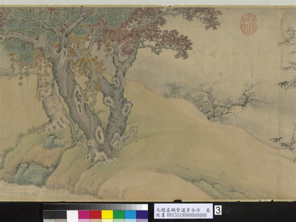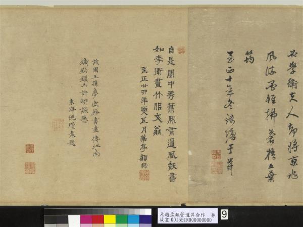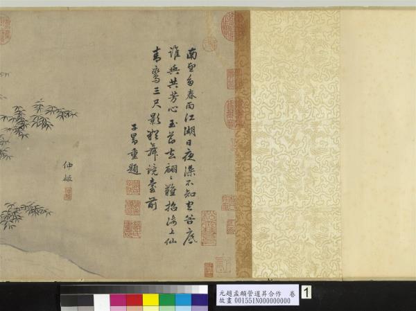 元趙文敏公蔚為儒宗。文章翰墨度越前古。魏國夫人聰明敻異。游戲翰學。妙絕當時。延祐間其畫竹與文敏公書並藏祕府。後世得其片紙隻字如獲兼金拱璧。不敢玩視焉。貞甫黃門性清雅。世好集古書畫。購求不較其值。故其家牙籤錦軸滿架盈櫝。復有此管趙合璧。予何敢褻玩焉。敬識其後。成化庚寅(西元一四七0年)冬長洲吳寬。