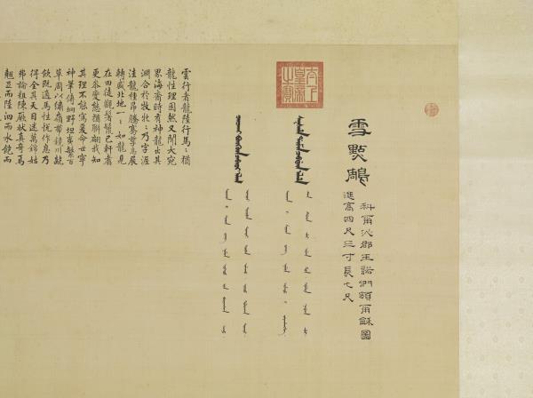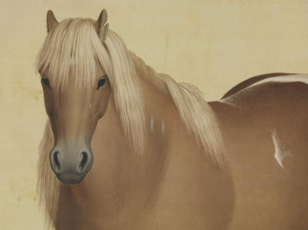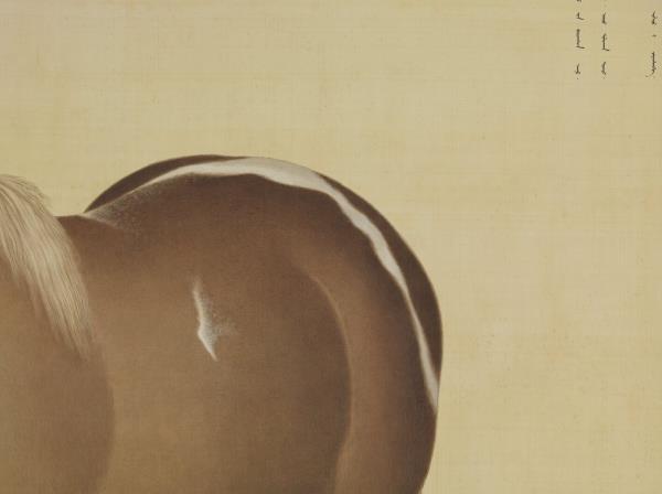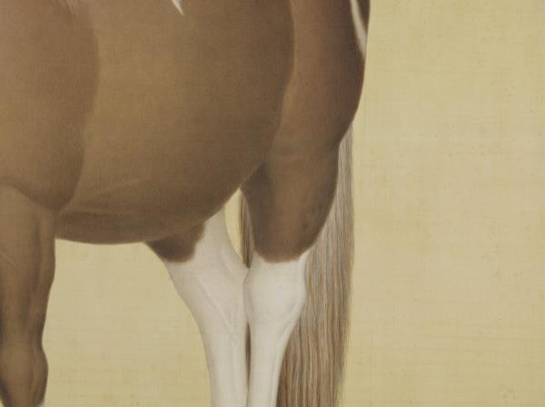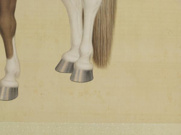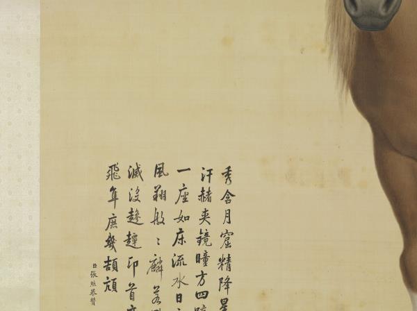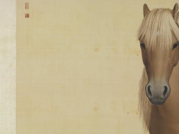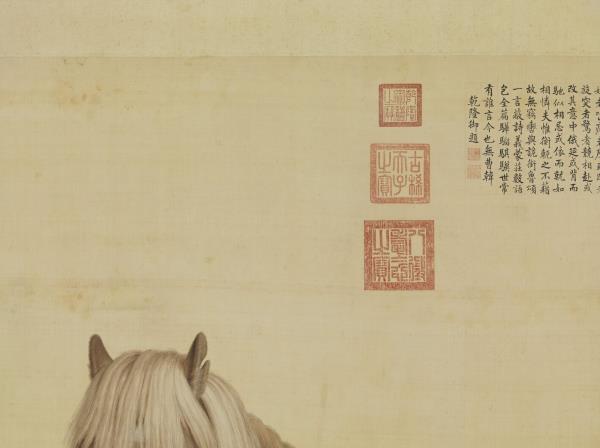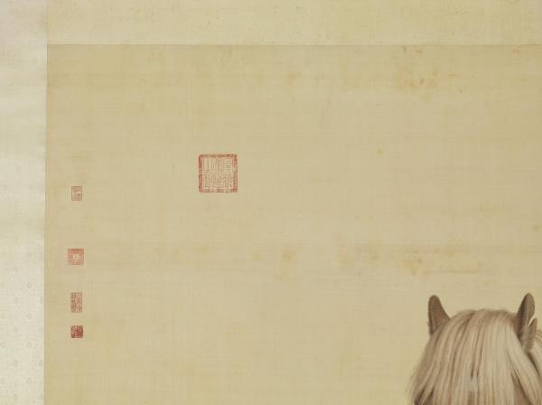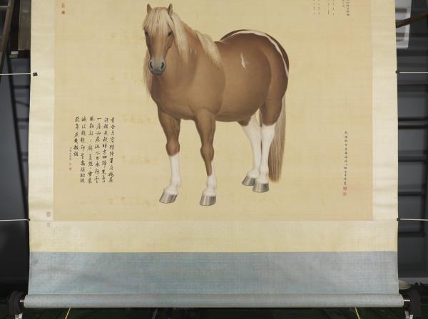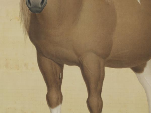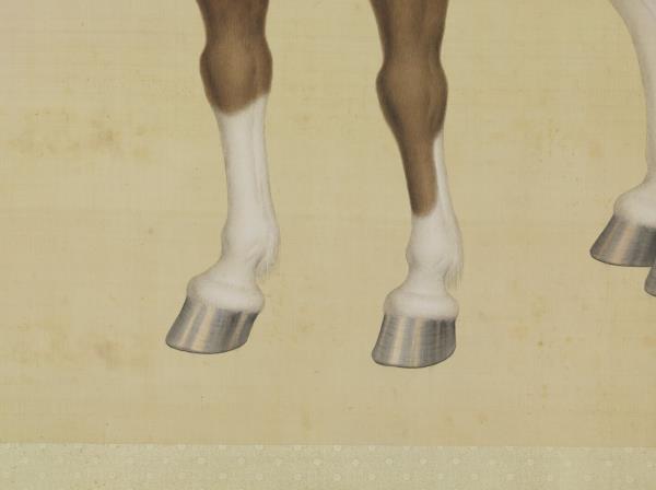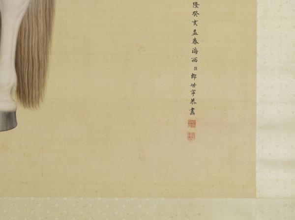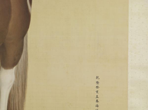 科爾沁郡王諾們額爾龢圖於乾隆八(西元一七四三)年,進貢駿馬一匹。郎氏奉旨寫生,大小尺寸與真馬近似,生動而逼真。