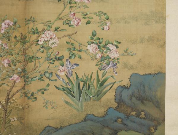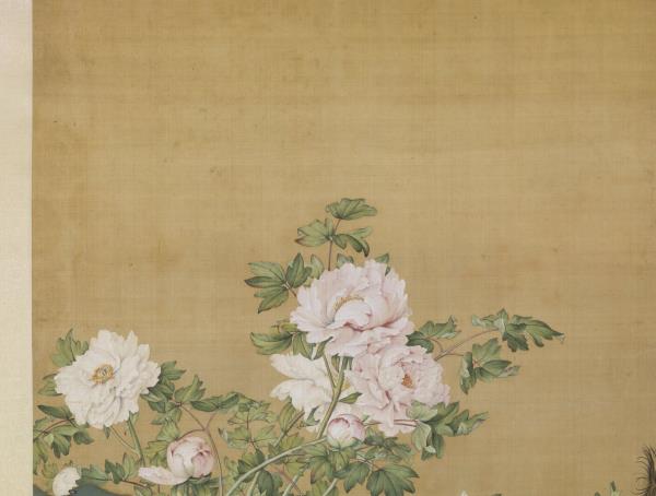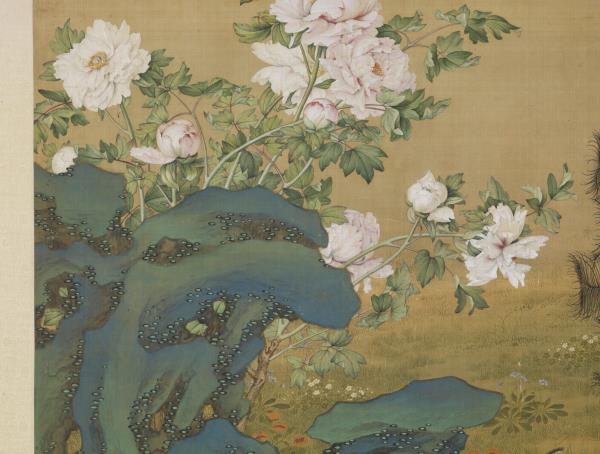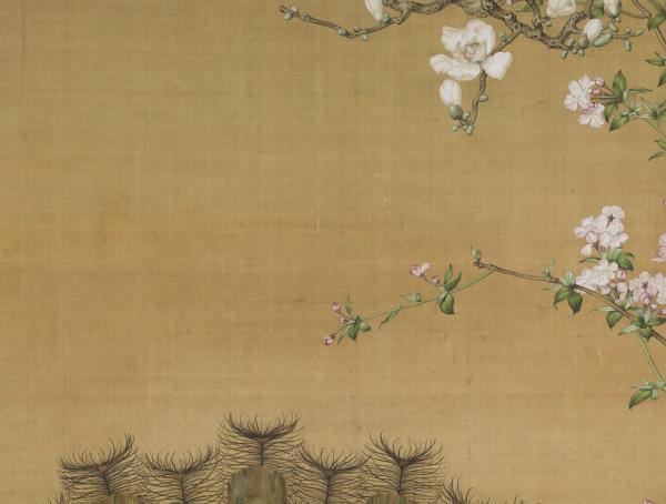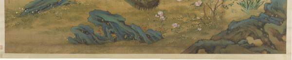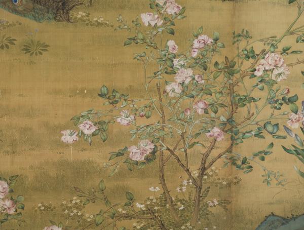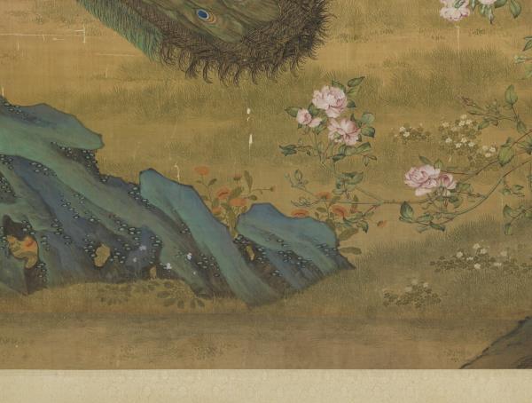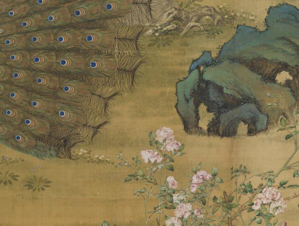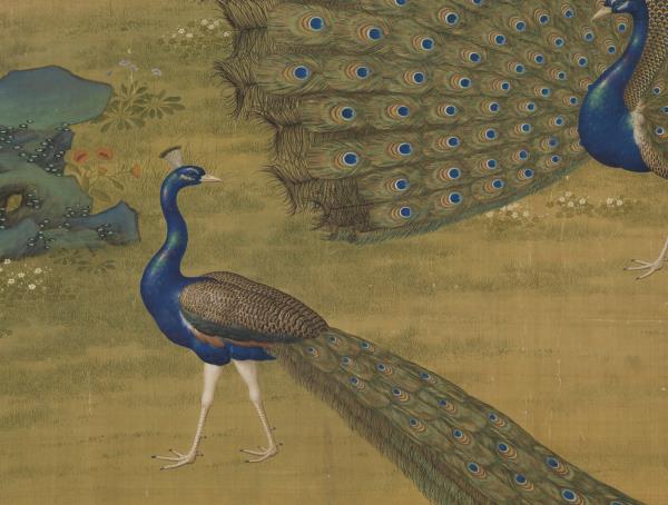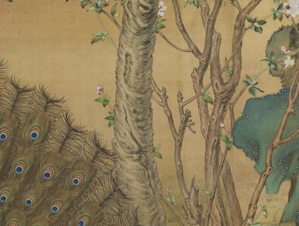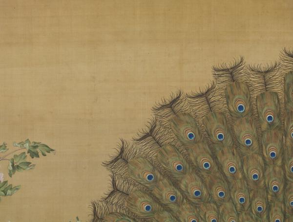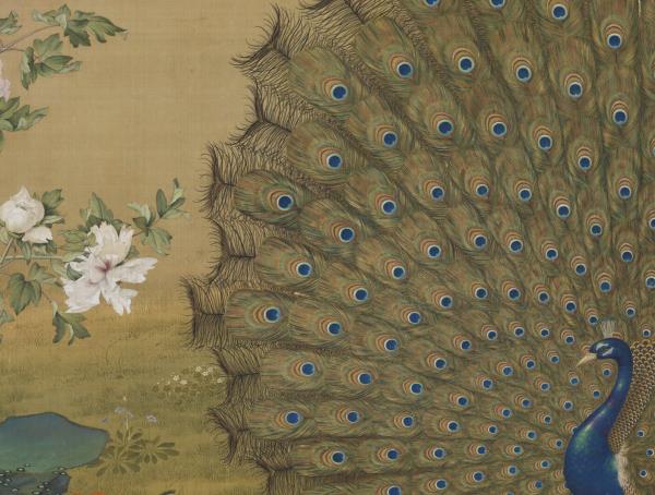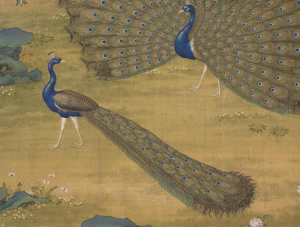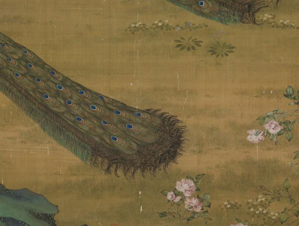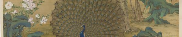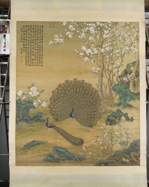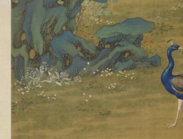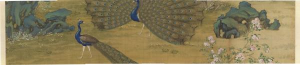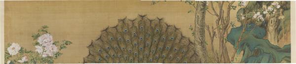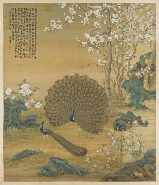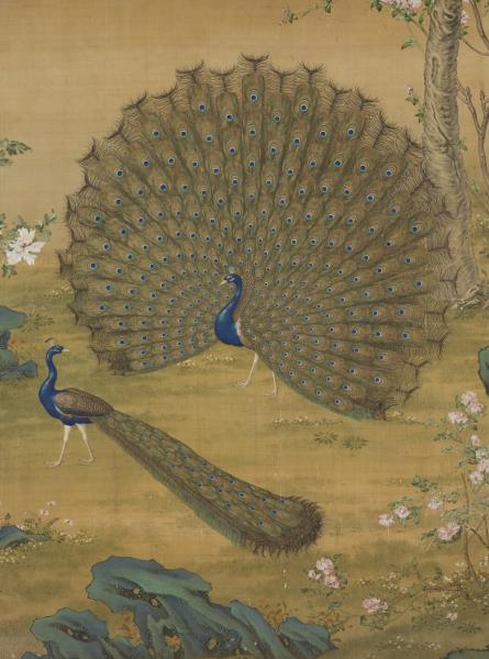 Description Lang Shih-ning was the Chinese name of the Italian Giuseppe Castiglione. At the age of 19, he became a Jesuit novitiate and studied painting and architecture. He arrived in China when he was 27 and eventually came to serve under three emperors at court. He excelled at painting figures, dogs, horses, and birds-and-flowers. This work is a depiction of peacocks roaming about a garden. Done on a huge hanging scroll, it is indeed impressive in both size and content. In addition to the traditional Chinese technique of “outlines filled with colors”, in which opulent colors are used, Castiglione also employed Western techniques of shading and modeling. This gives the work both a decorative and a realistic touch.