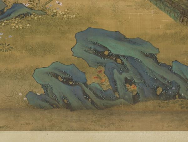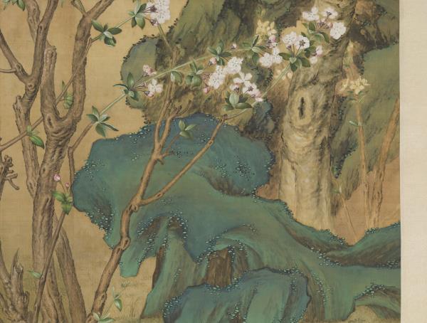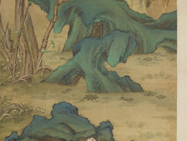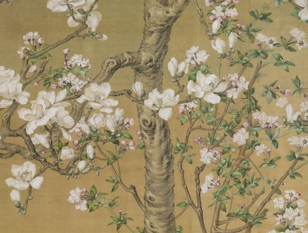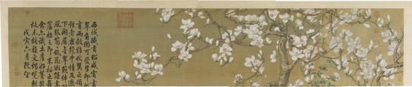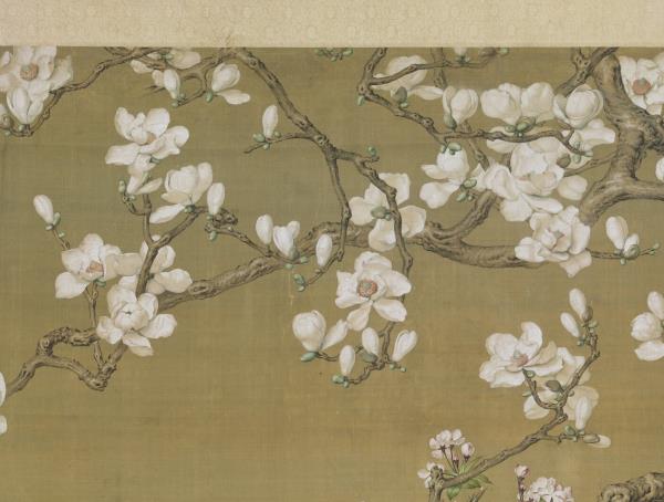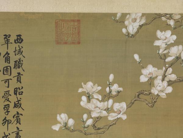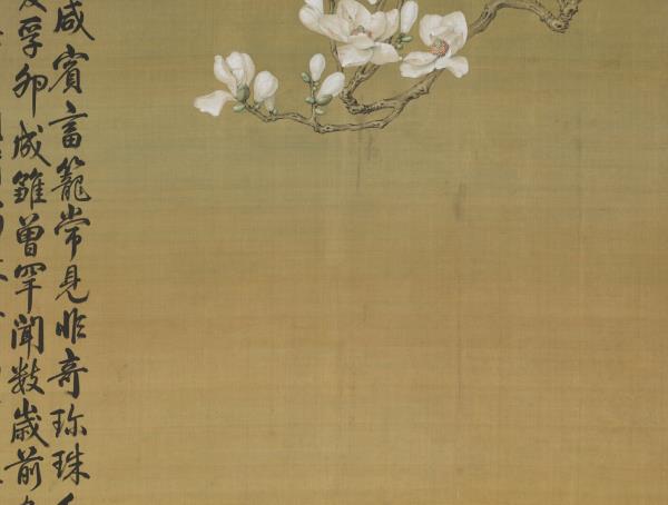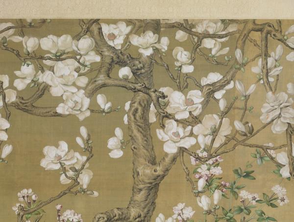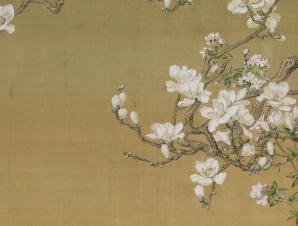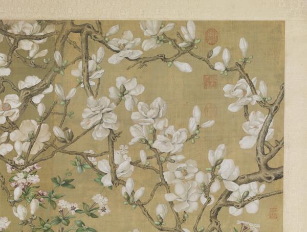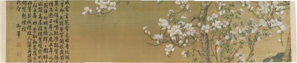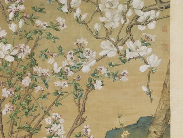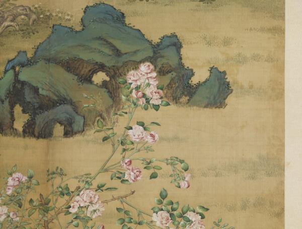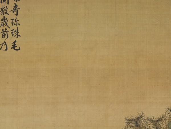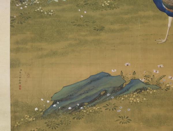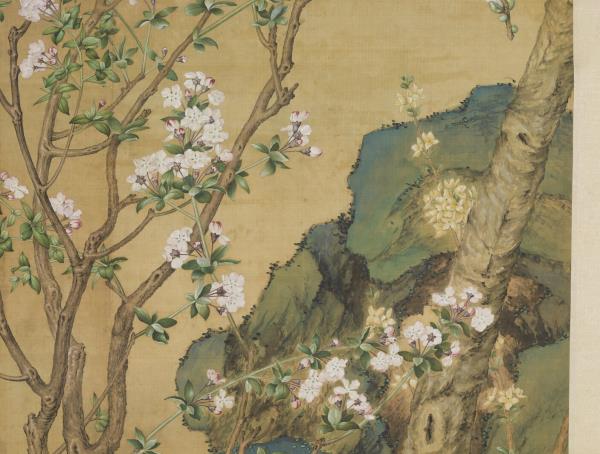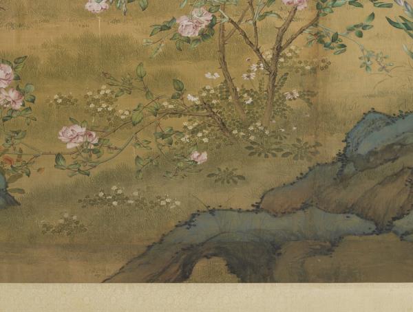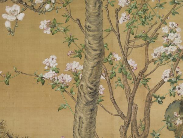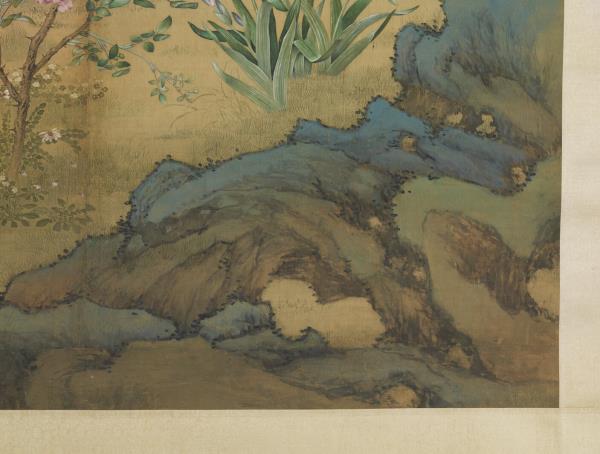 Description Lang Shih-ning was the Chinese name of the Italian Giuseppe Castiglione. At the age of 19, he became a Jesuit novitiate and studied painting and architecture. He arrived in China when he was 27 and eventually came to serve under three emperors at court. He excelled at painting figures, dogs, horses, and birds-and-flowers. This work is a depiction of peacocks roaming about a garden. Done on a huge hanging scroll, it is indeed impressive in both size and content. In addition to the traditional Chinese technique of “outlines filled with colors”, in which opulent colors are used, Castiglione also employed Western techniques of shading and modeling. This gives the work both a decorative and a realistic touch.
