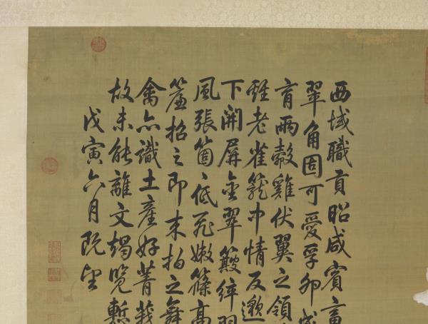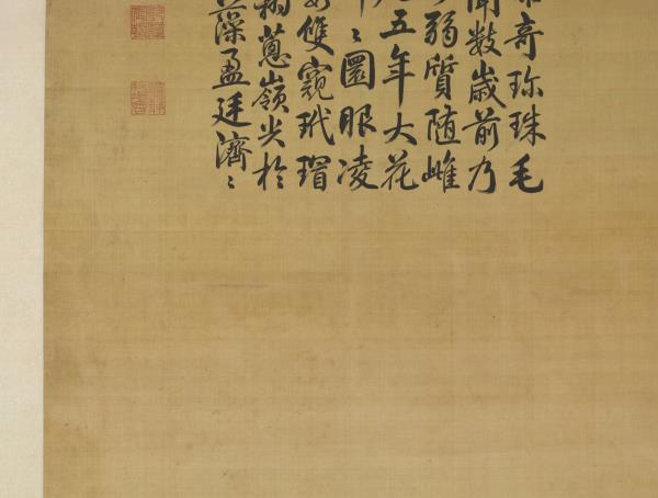 題跋 清高宗 印記 expand_more 本幅 戊寅(西元一七五八年)六月既望。御筆。 行書 西域職貢昭咸賓。畜籠常見非奇珍。珠毛翠角固可愛。孚卵成雛曾罕聞。數歲前乃育兩𪇄。雞伏翼之領哺噣。淋滲弱質隨雌雞。老雀籠中情反邈。三年小尾五年大。花下開屏金翠簸。綷羽映日煥輝。輝圜眼凌風張箇。箇低飛嫩篠髙屋。檐繡翣雙窺玳瑁。簾招之即來拍之。舞那慮翻翱葱嶺。尖於禽亦識土產。好菁莪棫樸風人。藻盈廷濟濟。故未能離文。朅覽慙懷抱。戊寅(西元一七五八年)六月既望。御筆。
