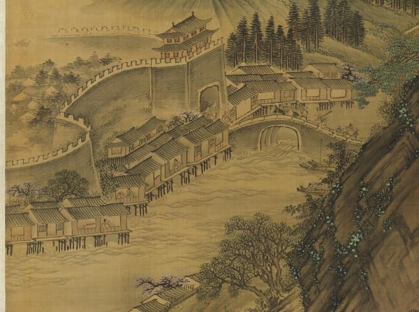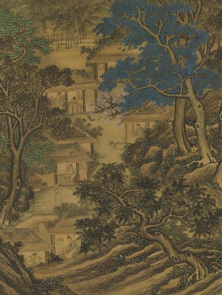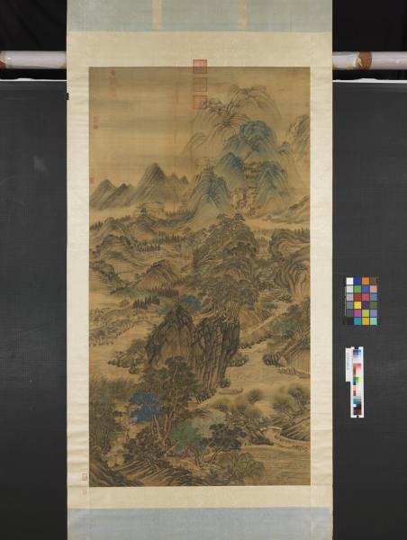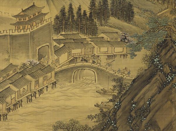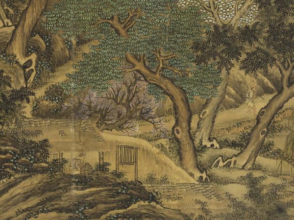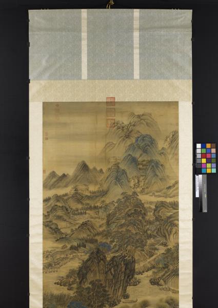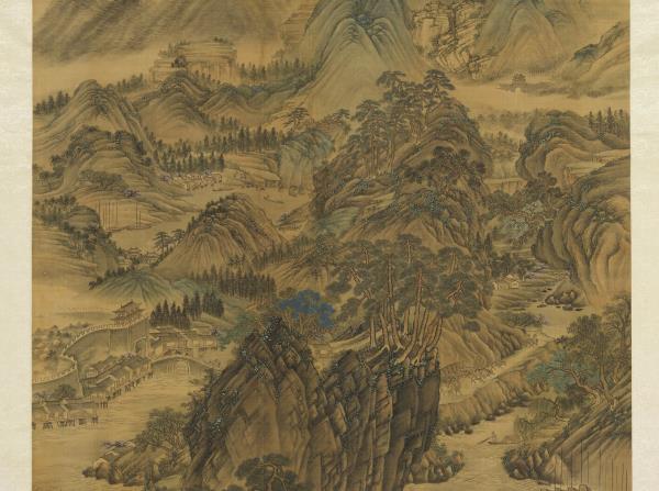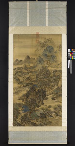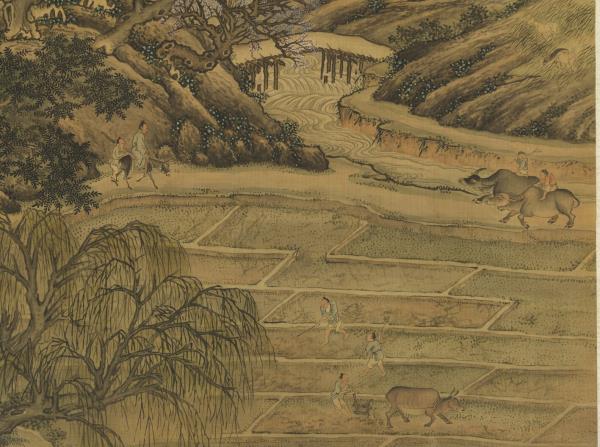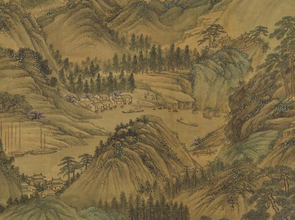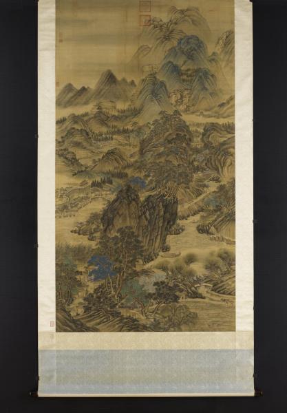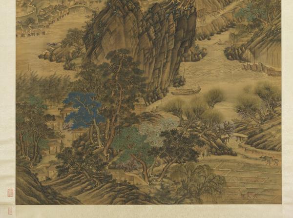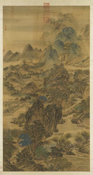In this work, layers of mountains, streams, and dwellings fill the picture space. Within, farmers are cultivating fields, and figures are traversing the mountain paths. The water-swelled streams and the luxuriant growth on the mountains express the abundance of spirit. The painting is everywhere vigorous and energetic with clearly defined strata of dark and light brushwork.