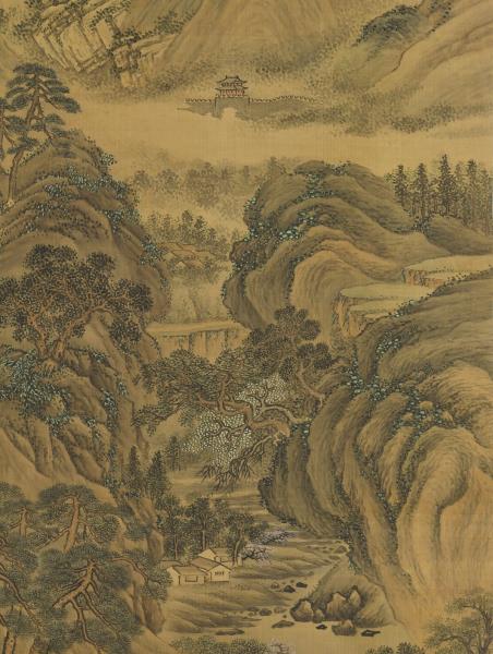 Gao Qipei (style name Weizhi; sobriquets Qieyuan, Nancun) was a native of Liaoning. He excelled at various subjects, such as flowers, animals, dragons, and figures, but he was particularly gifted at sedate landscapes and lively figures in the spirit of the Ming artist Wu Wei. He was also a famous finger painter with an expressive style. This work depicts layers of verdant hills and peaks with village and temple buildings. Boats travel on the river, and by the shore are fields and scenes of village life. Farmers work in the paddies as travelers go along the paths. The stream rushes by and spring mists envelope the distant peaks as spring hangs in the air. The brushwork is mature, and the ink tones and colors well ordered from light to dark in clear layers.(20100104)