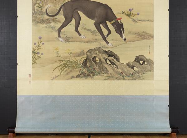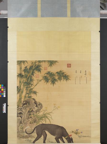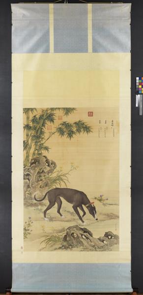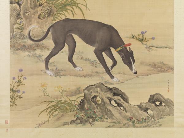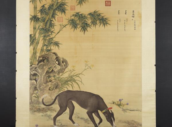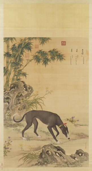 郎世寧(西元一六八八至一七六六),意大利人,十九歲時,入天主教耶穌會為修士,曾習西畫,兼習建築。二十七歲來華。以繪事供奉內廷,歷仕康熙、雍正、乾隆三朝。善畫人物花鳥,尤善犬馬。其畫法,於中國傳統中加入西洋光影透視法,以及西畫顏料。故凡諸所作,色彩穠艷,形象逼肖。此幅畫駿犬墨玉螭。