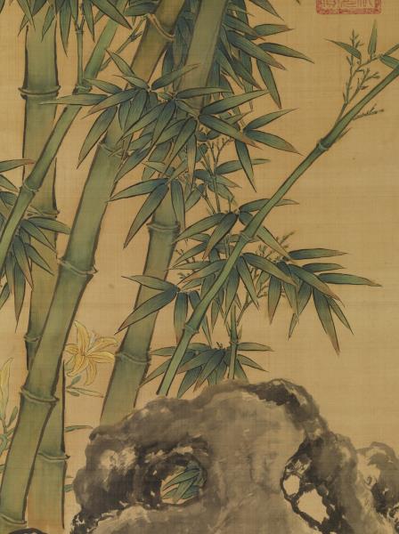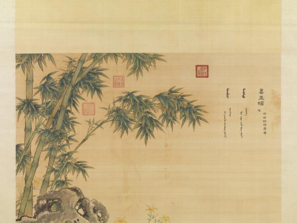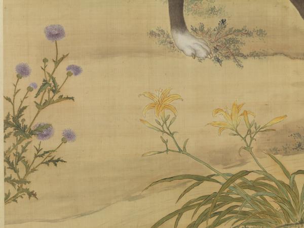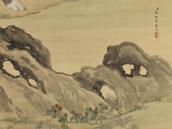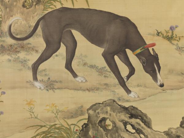 Mo-yu Ch’ih was given to the emperor by his chief bodyguard, Kuang Hua. The dog depicted is of the slender shorthaired variety, and has particularly bright eyes. The landscape background does not appear to be Castiglione’s work.