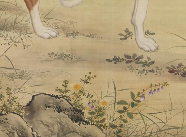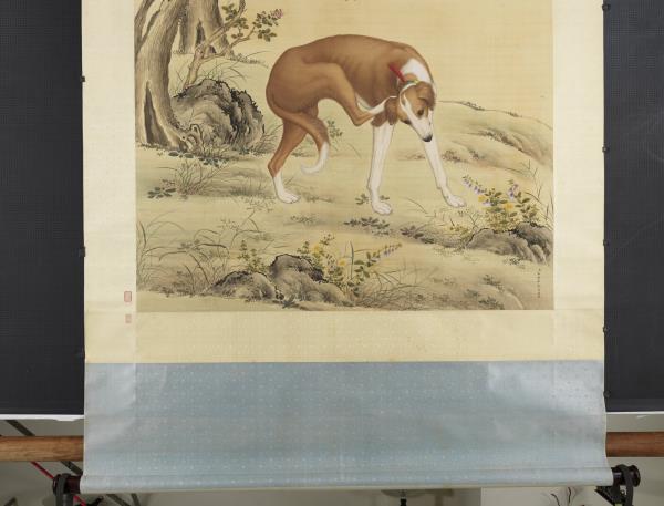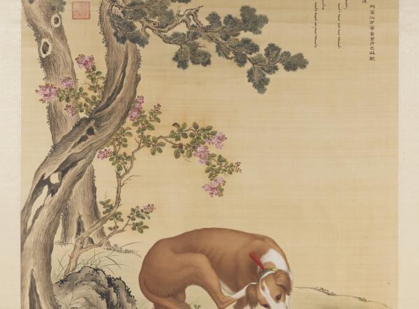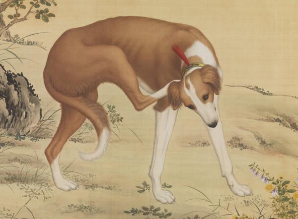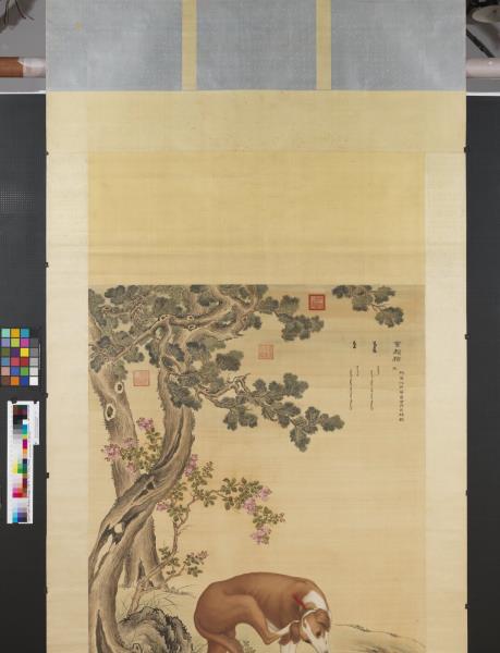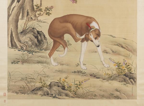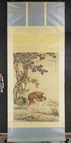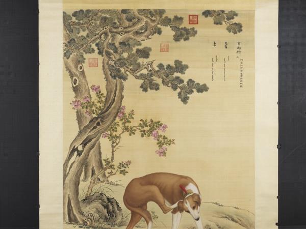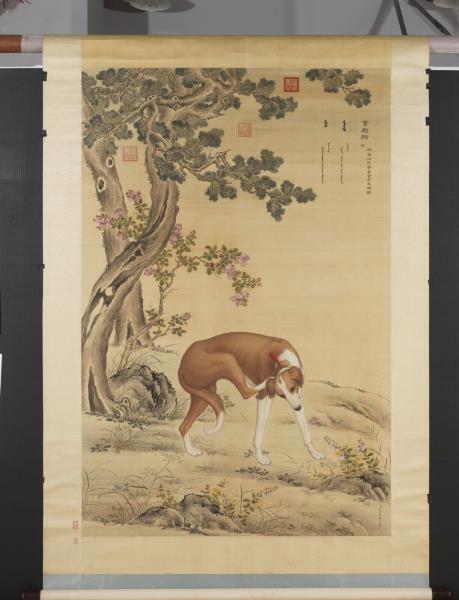 郎世寧(西元一六八八至一七六六),意大利人,十九歲時,入天主教耶穌會為修士,曾習西畫,兼習建築。二十七歲來華,以繪事供奉內廷,歷仕康熙、雍正、乾隆三朝。善畫人物花鳥,尤善犬馬。其畫法,於中國傳統中加入西洋光影透視法,以及西畫顏料。故凡諸所作,色彩穠艷,形象逼肖。此幅畫駿犬金翅獫。