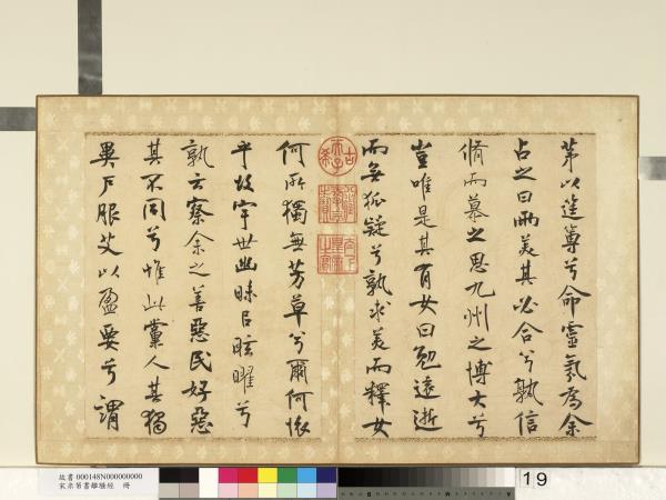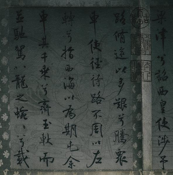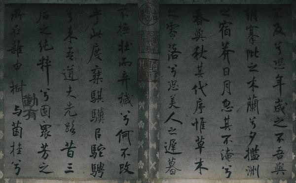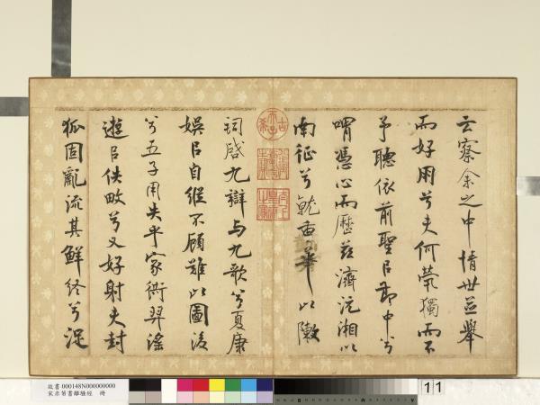 右離騷經墨跡。凡二千四百餘字。首尾完善。法書中至寶也。李東陽跋為米芾書。稱其溫潤縝密。董其昌容臺集。亦載米元章行書離騷。宜興吳民部所藏。真海內奇觀。兩人皆精於書者。其推許應非虛譽。第李跋謂克溫學士出此卷。董跋謂近始裝潢成帙。兩人所見不同。初竊疑之。及諦視冊紙。每閱五幅。即有一接湊而成者。或前或後。不過一二寸。使當日就方幅作書。不應襞積若此。今以合縫量之。相去約五尺許。可見紙幅本長。曩固通聯成卷。後乃分鈲為冊耳。即此可為由卷改冊之據。至紙間勤有二字。評紙諸書。雖無可考。而天祿琳琅所藏宋版古列女傳。有建安余氏靖菴。刊于勤有堂標記。考岳珂九經三傳沿革例云。世傳九經有建安余氏所刊者。稱為善本。按宋真宗咸平四年。摹印九經頒行。其時海內盛行鏤版。是珂所云建安余氏善本。當在其時。第勤有堂名。未詳所自始。茲蒙宣諭閩浙督臣鐘音。於建安訪之。覆奏云。核其家譜。余氏祖煥。自南北朝遷入閩中。其十四世孫徙居建陽之書林。書林在唐時已為鬻書之地。余氏即習其業。煥之二十五世孫余文興。以舊有勤有堂之名。號為勤有居士云云。則知勤有之名。在北宋已有之。又云建安書籍盛行。余氏獨於他處購選紙料。印記勤有二字。此紙或出建安余氏所購。未可知也。又考克溫。乃吳儼字。宜興人。明成化丁未進士。官禮部尚書。曾為侍講學士。東陽所指。蓋即其人。而其昌所云吳民部者。名鳴虞。亦宜興人。嘉靖壬戌進士。由戶部主事晉郎中。終於吏部。以其科第年分計之。鳴虞後儼七十餘年。當是其孫輩。蓋儼所藏。本係字卷。或年久損敝。鳴虞重裝為冊。以便披閱。亦不可知。獨未解其既寶世澤弗失。而於藏弆之由。改裝之故。不一識之。何率略乃爾。至其昌既已筆之於書。而不為題之於冊。理皆不可曉。或董跋向固在冊間。後乃散佚不全耶。夫芾書至今六百餘年。東陽未跋以前。不聞有人稱道之。既跋以後。又不見有人踵題之。而是米蹟也。始何以歸之於吳。繼復何以由吳歸車氏。亦更無人為之詳敘而備識之。說者幾以芾書之尠所表見為憾。今一旦登石渠。塵乙覽。經大聖人之品題。而其書以顯。其名益因以信。是芾因不署款。而得邀真賞。不可謂非異代遭際之榮歟。日月出而爝火息。東陽之跋。其昌之書。有無皆不足計。又豈臣等螢燿之微。所足分光於餘照者哉。臣于敏中。臣王際華。臣梁國治。臣董誥。臣沈初恭跋。 |