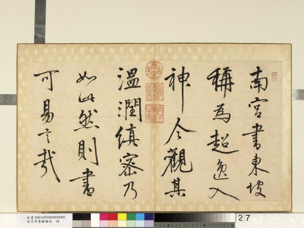 南宮書。東坡稱為超逸入神。今觀其溫潤縝密乃如此。然則書可易言哉。克溫學士。深於書者。偶出此卷。因相與評之。東陽。 |