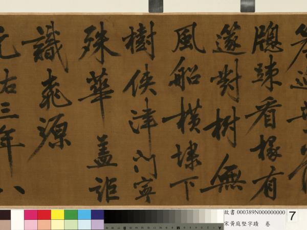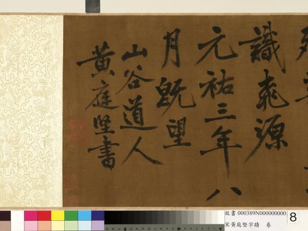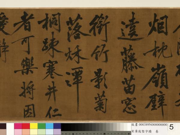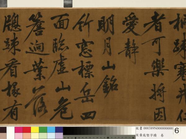 至仁山銘。山橫鶴嶺。水學龍津。瑞雲一片。仙童兩人。三秋雲薄。九日寒新。真花蹔落。畫樹長春。橫石臨砌。飛烟枕嶺。壁遶藤苗。窗銜竹影。菊落秋潭。桐踈寒井。仁者可樂。將因愛靜。 明月山銘。竹窗標岳。四面臨虛。山危簷迥。葉落牕踈。看椽有篴。對樹無風。船橫埭下。樹俠津門。寧殊華蓋。詎識桃源。元祐三年(西元一0八八年)八月既望山谷道人黃庭堅書。 |
