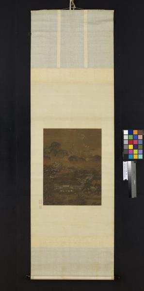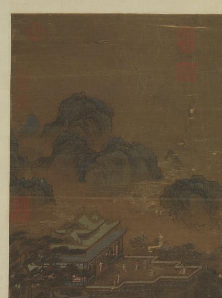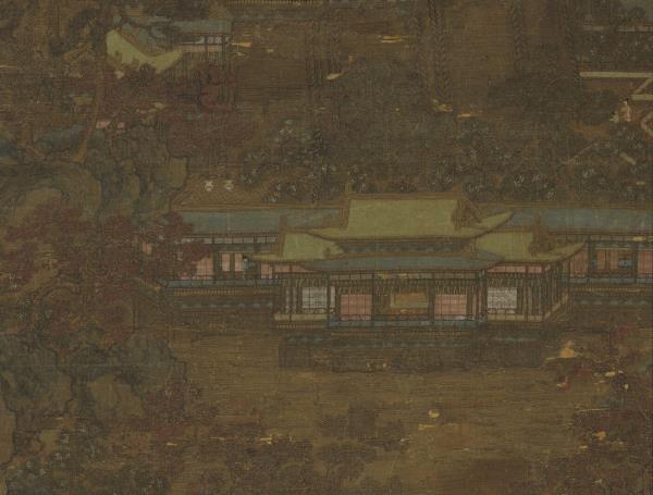 The main building here has an unusual triple-eave, hip-and-gable roof with penetrating ridges. The roof is colored with azurite and malachite, but the artist did not use lines to show individual tiles. The ridge and tile ornaments were all done with gold, and the brackets appear ornate. The hall over the water has 1 to 3 brackets distributed above the lintels, similar to Yuan (1279-1368) examples and comparable to the Museum's The Chien-Chang Palace, an anonymous Yuan painting. This grand yet delicate palatial setting includes pines, hills, and a pond. Clouds swirl as palace ladies engage in music and song. The style is close to that of Wang Cheng-p'eng (1275-1328), indicating it may have been done by a Yuan court painter.