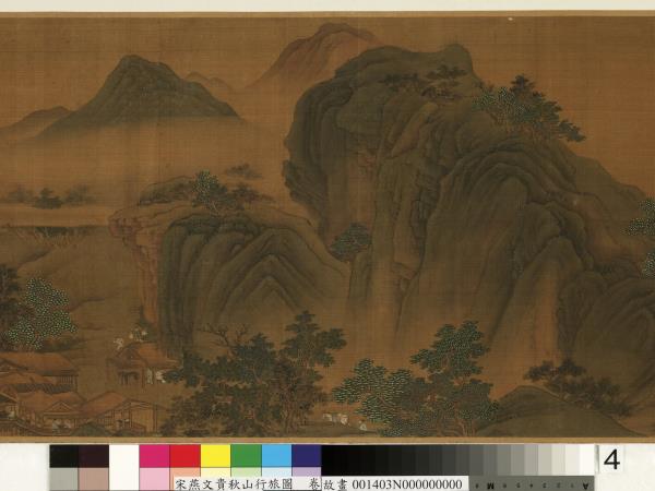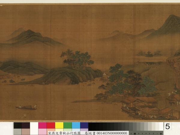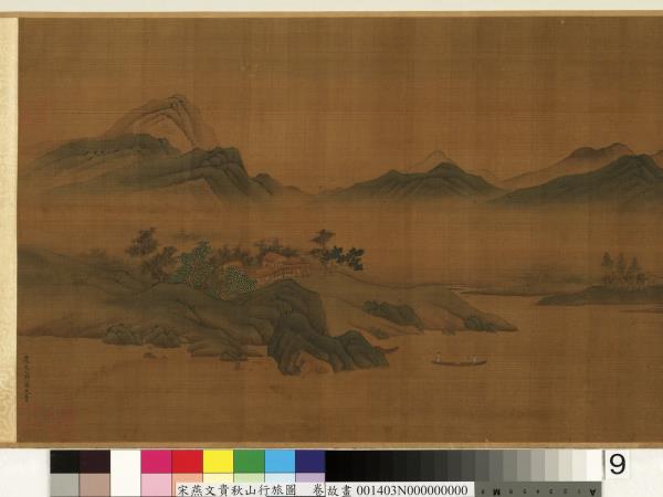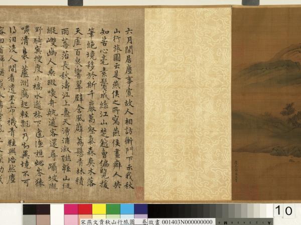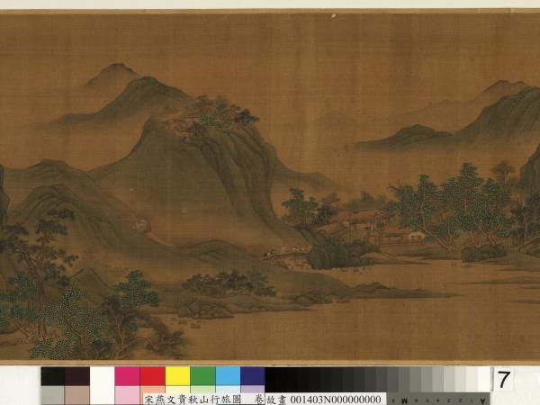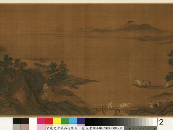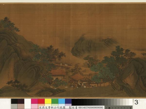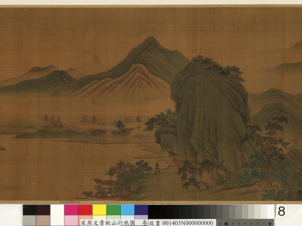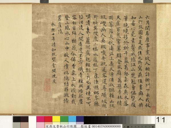 六月閑居塵事寡。故人相訪衡門下。示我秋山行旅圖。云是燕侯之所寫。燕侯畫癖人共知。苦心毫素鬢成絲。江山楚越曾偏覽。援筆絕境移於斯。千巖萬壑氣森爽。木落天虛百泉響。翠壁含風薜荔懸。青林積雨莓菭長。秋濤江上兼天湧。浦漵聯緜山縱(縱字重複)𡾼。幽人乘暇喚舟航。逋客還尋躡坡隴。野騎冥搜度小橋。水邊林下逢漁樵。煙岑猿嘯清裊裊。蘆洲雁起輕飄飄。乃知異境不可得。汨沒人間看遺墨。布襪青鞋興浩然。塵容白首歸猶惑。依俙雲氣上衣襟。動我登山臨水心。山中故人儻招隱。結茆擬傍蒼崖陰。永樂十年清和既望雲間沈度。 |