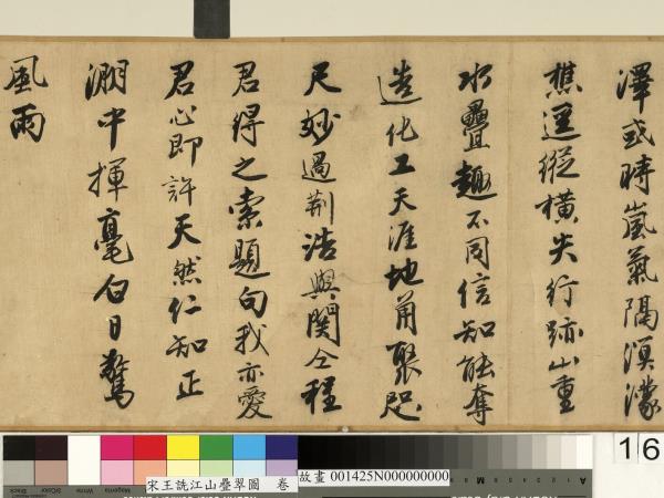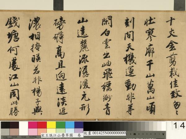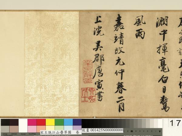 林莉娜、陳建志、鄭淑方,〈宋王詵江山疊翠圖 卷〉,收入《明四大家特展-唐寅》(臺北:國立故宮博物院,2014.07),頁224-225、318。