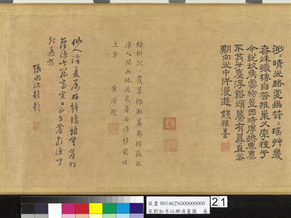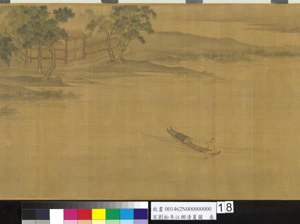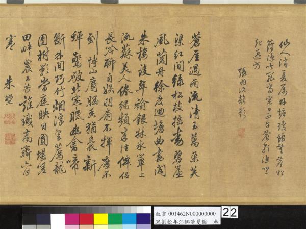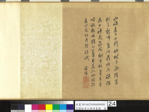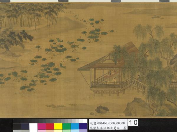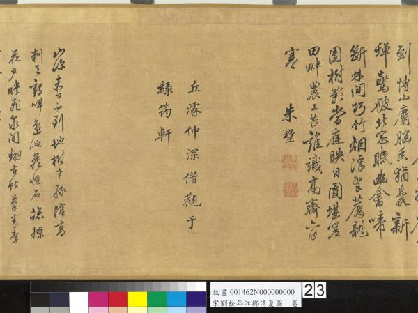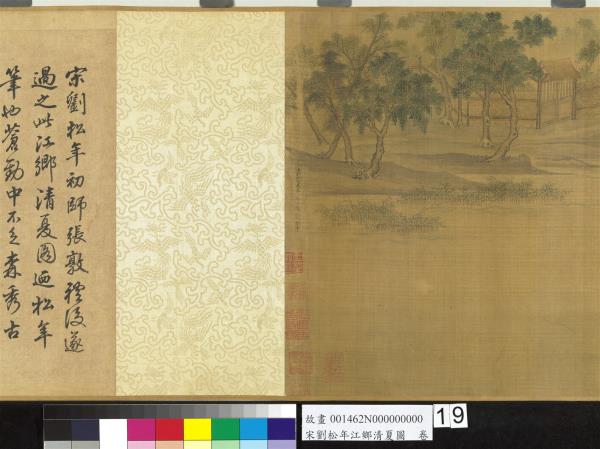 宋劉松年初師張敦禮。後遂過之。此江鄉清夏圖迺松年筆也。蒼勁中不乏森秀。古雅處復帶鮮妍。誠畫院中之首推。宜仲英之珍若拱璧耳。錢塘白珽。 |