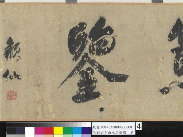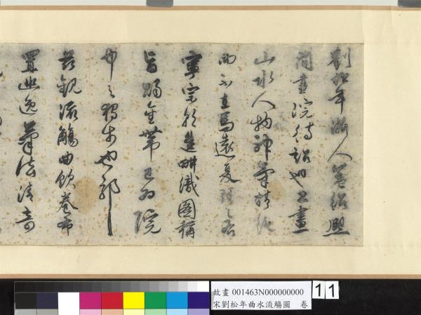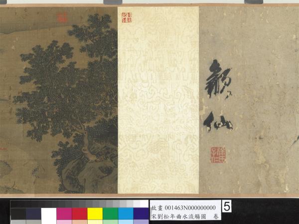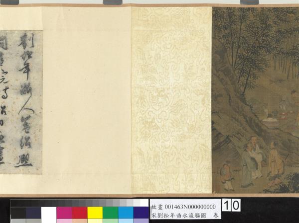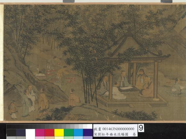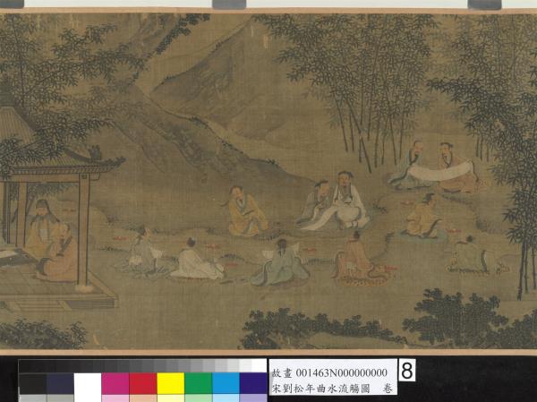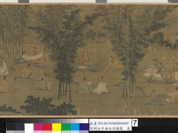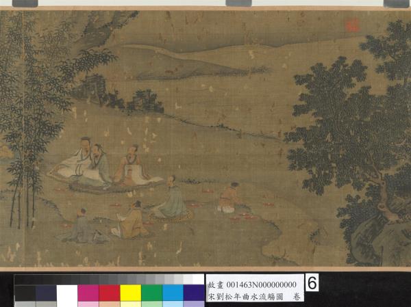 劉松年浙人。蓋紹熙間畫院待詔也。工畫山水人物。神氣精絕而不在馬遠夏珪之右。寧宗朝進耕織圖稱旨。賜金帶。已為院中之獨步也耶。茲觀流觴曲飲卷。布置幽逸。筆法清奇。觀者神驚目恍。藏者珍之。安成彭時跋。 |