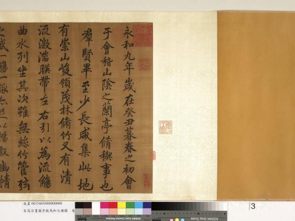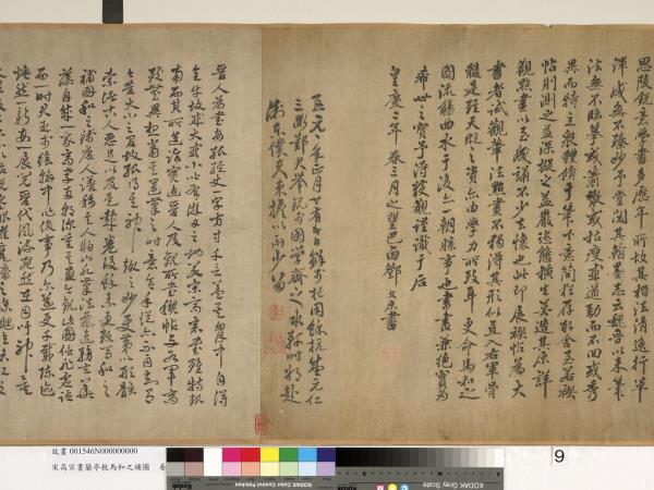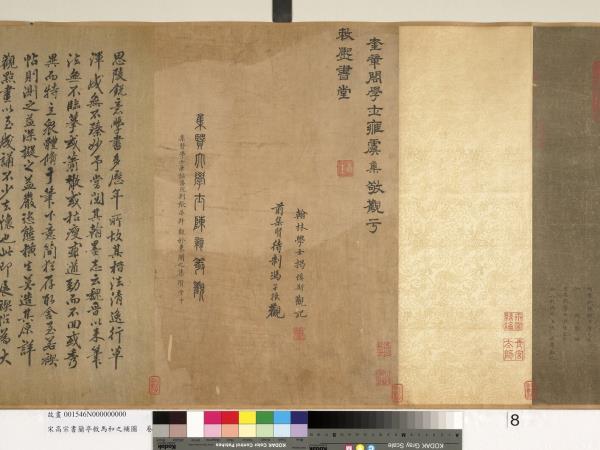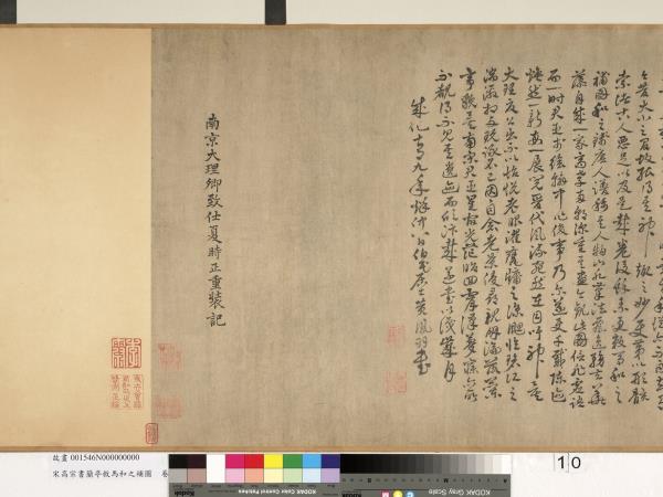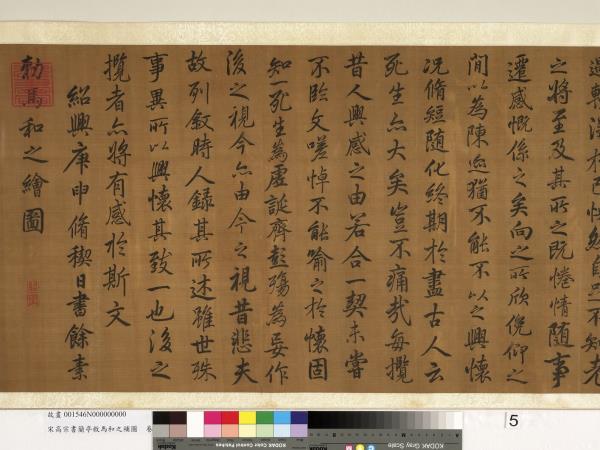 思陵銳意學書。多歷年所。故其楷法清逸。行草渾成。無不臻妙。予嘗閱其翰墨志云。魏晉以來。筆法無不臨摹。或蕭散。或枯瘦。並遒勁而不回。或秀異而特立。眾體備于筆下。意簡猶存取舍。至若禊帖則測之益深。擬之益嚴。恣(應為姿)態橫生。莫造其原。詳觀點畫。以至成誦。不少去懷也。此即展禊帖為大書者。誠觀筆法點畫。不獨得其形似。直入右軍骨髓。是雖天縱之資。亦由學力所致耳。更命馬和之圖流觴曲水于後。亦一朝勝事也。書畫兼絕。實為希世之寶。予得獲觀。謹識于后。皇慶二年春三月之望。巴西鄧文原書。 |