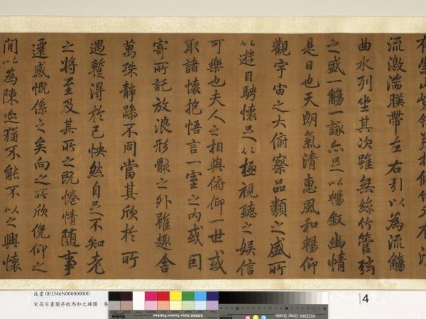 晉人為書。每能經丈一字。方寸千言。蓋其胸中自得全牛。故或大或小。皆有游刃之地。若宋高宗書。雖特起。南(當為然之誤)而其所造詣。實返晉人。及觀所書禊帖。與右軍高致。無異相當。其運筆之時。意合手從。亦不自知有今昔大小之間。故能得其神趣之妙。使第以形骸索諸古人。惡足以及是哉。卷後餘素。更敕馬和之補圖。和之錢唐人。譜稱其人物山水筆法飄逸。務去華藻。自成一家。高孝兩朝。深重其畫。今觀此圖。信非虛語。而一時君臣於繪翰中作俊事乃爾。遂使千載陳跡。煥然一新。每一展玩。晉代風流。宛然在目。吁。神矣。大理夏公出示以怡悅老眼。濯甕牖之涼颸。憶碧江之湍激。相與玩詠不已。因自念老景侵尋。親朋淪落。蘭亭貌異。南宋君臣。星宿光茫照回霄漢。夢寐亦所不睹得。不見其遺迹。而欣汴哉。遂書以識歲月。成化十有九年秋仲八日伯民居土黃鳳羽書。 |