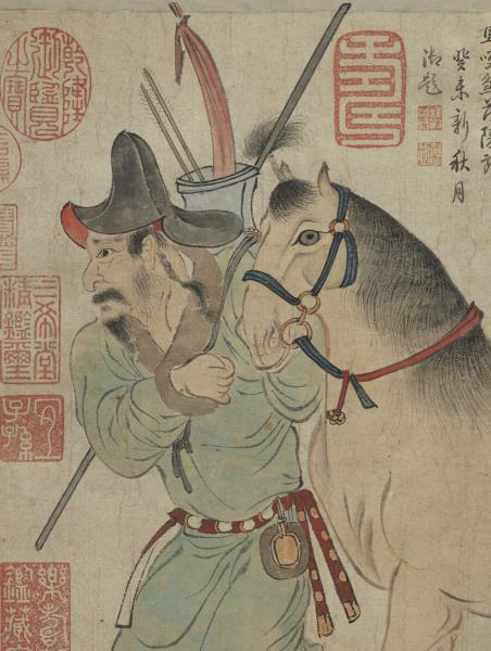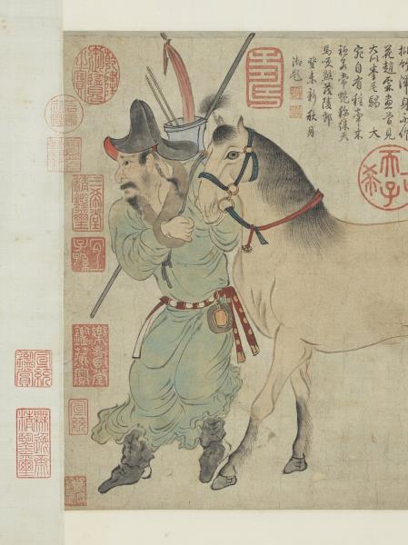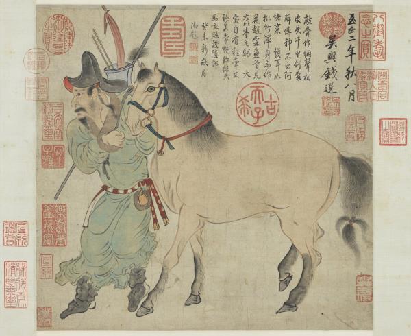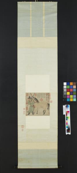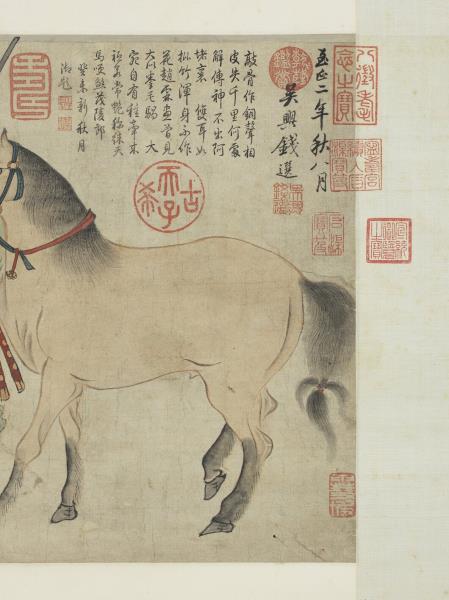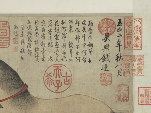 (第一則)敲骨作銅聲。相皮失千里。何處解傳神。不出阿堵裡。(第二則)雙耳如批竹。渾身不作花。趙霖畫曾見。大似拳毛騧。(第三則)大宛自有種。牽來祇若常。艷稱徠天馬。笑煞茂陵郎。癸未(西元一七六三年)新秋月御題。 |