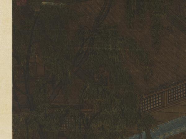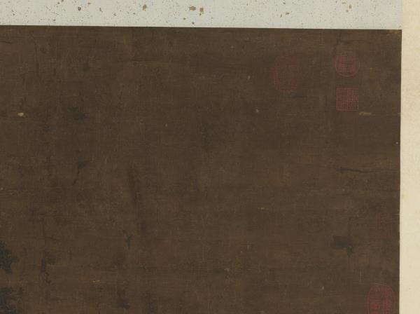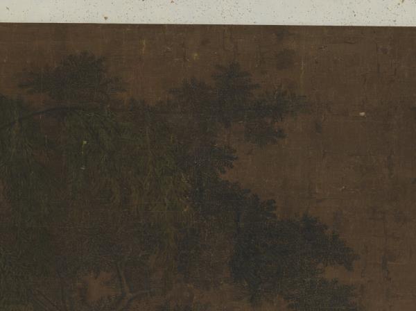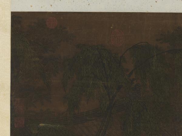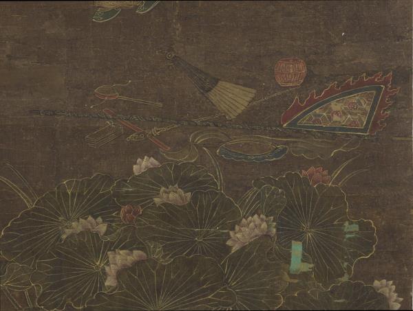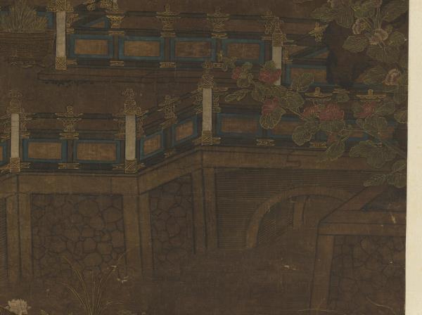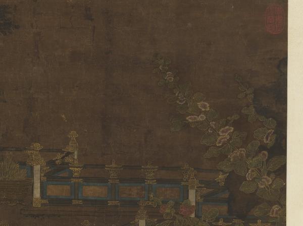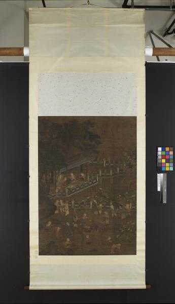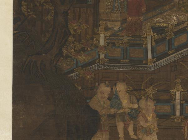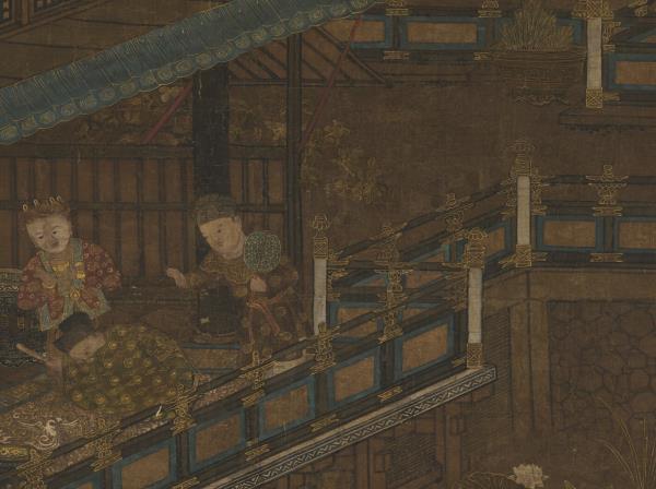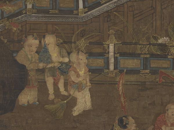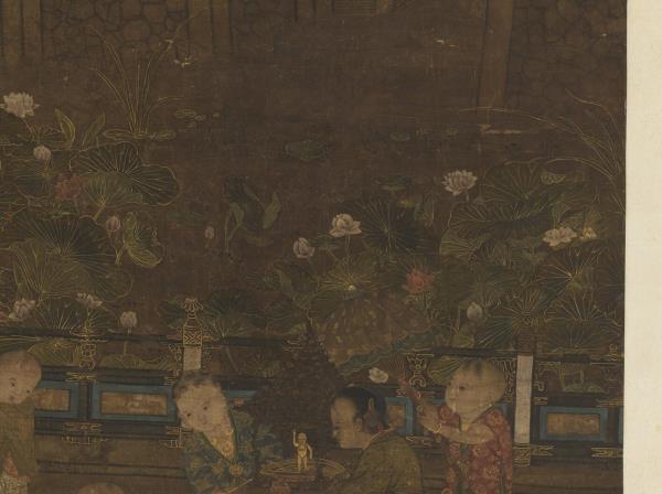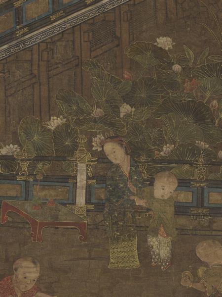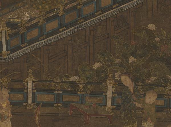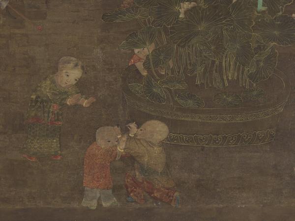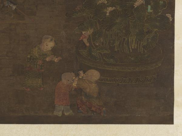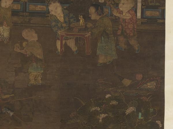 Su Han-ch'en was a native of K'ai-feng, Honan. He was employed as a Painter-in-Attendance at the Painting Academy during the Hsuan-ho reign of the Northern Sung. After the Northern Sung fell to Chin, he fled south and was reemployed in his old position at the Southern Sung court during the Shao-hsing reign (1131-1162). Su Han-ch'en studied with Liu Tsung-ku. He excelled as a figure painter, especially of religious subjects and children. Lotus flowers blossom in a pond by winding bridges and a pavilion in the shade of trees on the day of the Dragon Boat Festival. A group of children are at play, performing theatrical skits, dancing with pennants, picking lotus flowers, beating cymbals and chasing dragonflies. Their joy overflows. The figures are described with spirit and vitality, and the various toys arrayed on the ground are depicted with an eye for extraordinary detail. The important subjects are all given gold outlines, which gives the painting a luxurious, decorative quality.