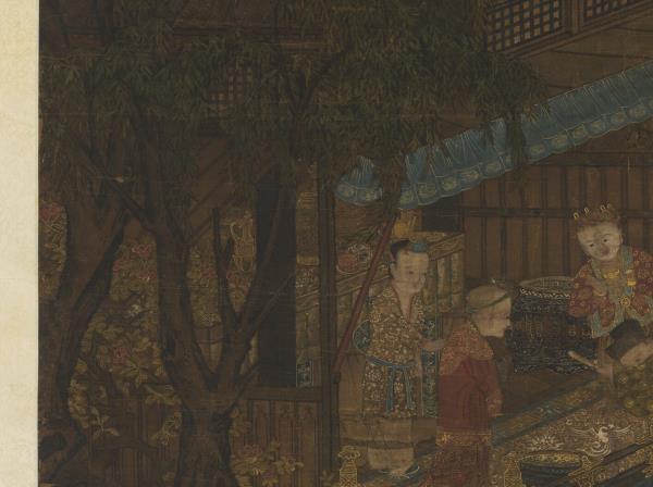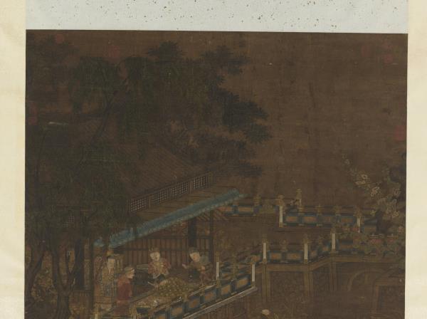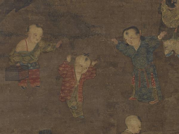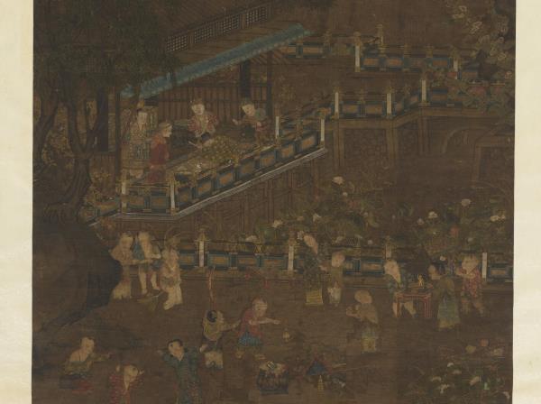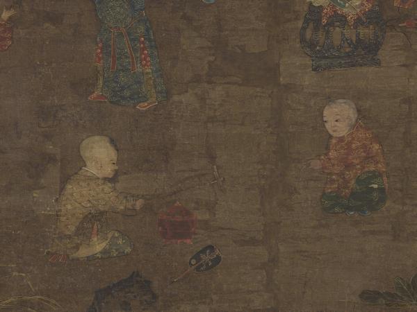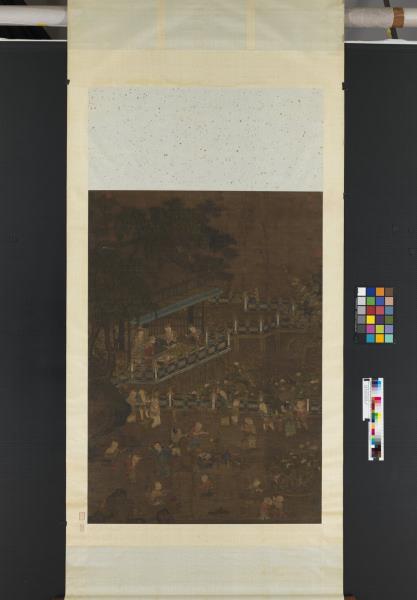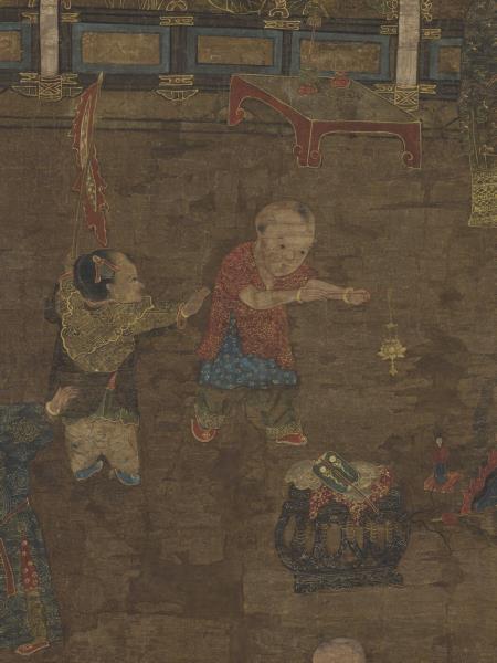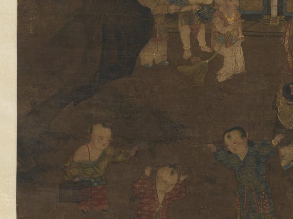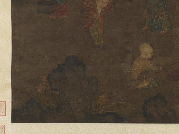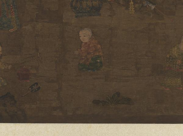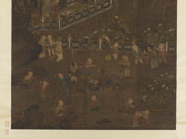 春日庭院,胡床屏風,三位嬰兒據床觀賞瓶中游魚,兩位於草地上玩弄陀螺,旁有一嬰孩著紅衣,臉戴面具,高揚朱筆,另一嬰孩,背負幼兒,循階而下,前來相會。本幅色彩頗為古雅,線條細緻中亦不失靈活特色。蘇漢臣(約西元十二世紀),河南開封人,曾任宣和畫院待詔,北宋亡於金後,南宋紹興年間又進畫院復職。師劉宗古,工畫道釋、人物臻妙,尤擅嬰孩。