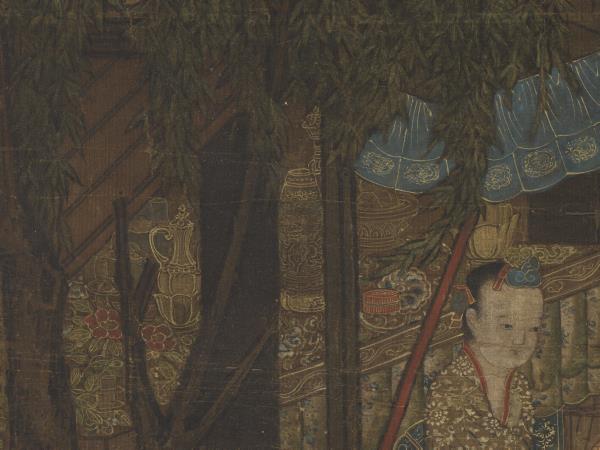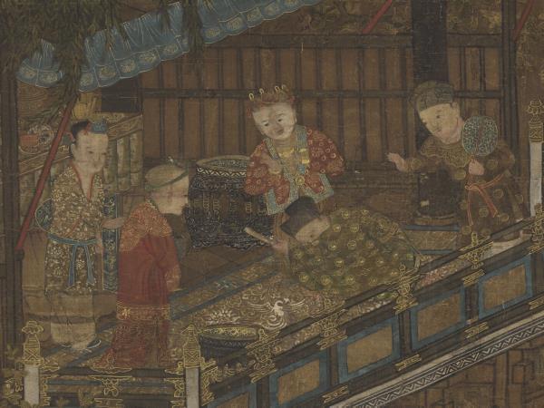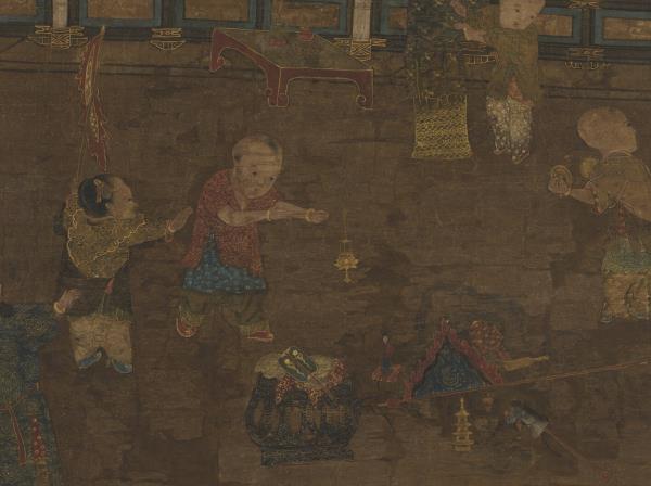 Su Han-ch'en was a native of K'ai-feng, Honan. He was employed as a Painter-in-Attendance at the Painting Academy during the Hsuan-ho reign of the Northern Sung. After the Northern Sung fell to the Chin, he fled south and was reemployed in his old position at the Southern Sung court during the Shao-hsing reign (1131-1162). Su Han-ch'en studied with Liu Tsung-ku. He excelled as a figure painter, especially of religious subjects and children. A lounge (ho bed) and screen are seen in the garden on a spring day. Three children stand upon the lounge to catch the fish swimming in glass vases. Two others are playing with tops. Another, wearing red clothes and a mask of Chung K'uei, the Demon Queller, raises a red writing brush. Yet another child descends to meet the group, carrying a baby on his back. The colors are antique and the brush lines are very fine. The painting is infused with an enchanting liveliness.